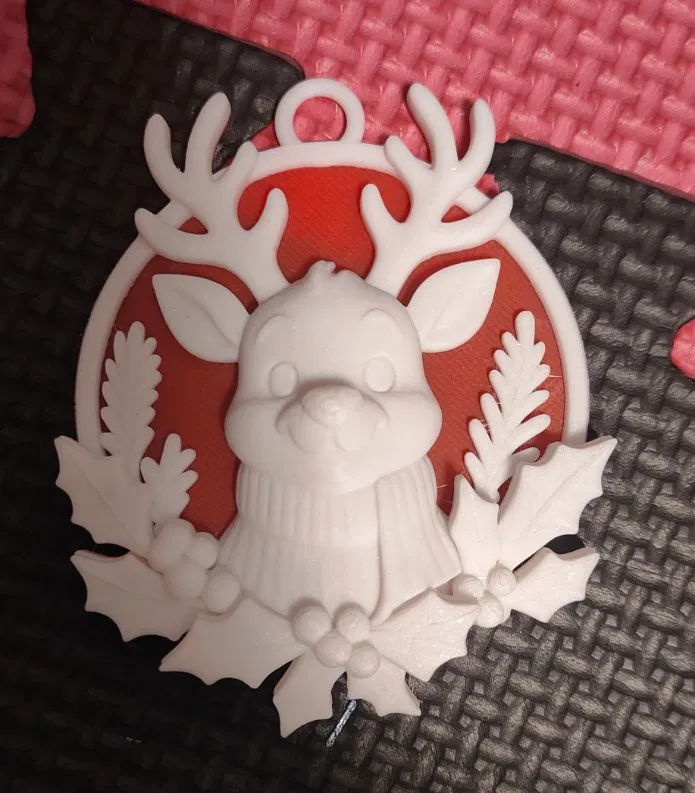 Ornament tuần lộc dễ thương với lá holly và khăn choàng mùa đông, mang vibe ấm áp ngày lễ. Thiết kế dạng layer hỗ trợ in 2+ màu, phù hợp đổi filament hoặc máy in multi-material để treo cây thông, gói quà.