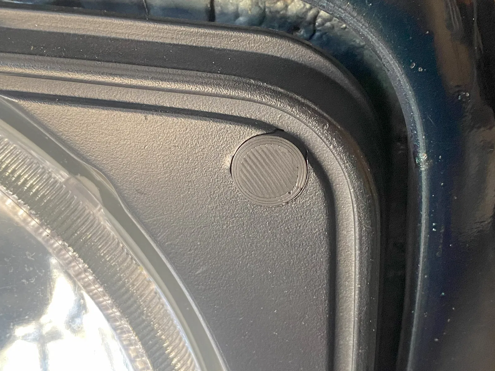 Nắp che lỗ/đầu ốc trên lưới tản nhiệt 4 tròn của VW Cabriolet 1988-1993 (155 853 125 trái, 155 853 126 phải). Dựng theo đo đạc thực tế, clips chặt hơn; khuyến nghị thêm urethane hoặc sticky tack để khỏi rớt.