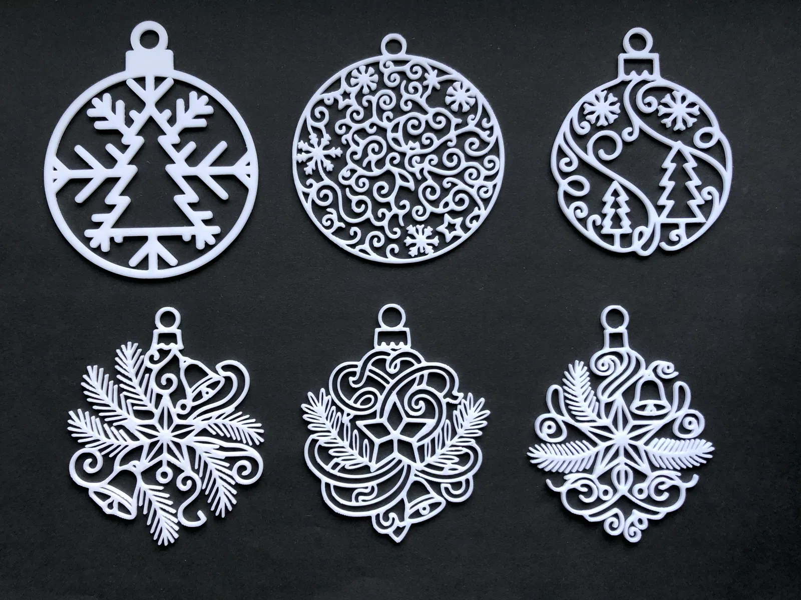 Giới thiệu bộ 6 món đồ trang trí Giáng Sinh dạng phẳng hoa văn tinh xảo (cầu kỳ), quá hợp để trang trí cây thông Noel của bạn thật nhanh mà vẫn đẹp mắt! Những món trang trí nhẹ, mảnh và tinh tế này được thiết kế để tối ưu hiệu suất in 3D.