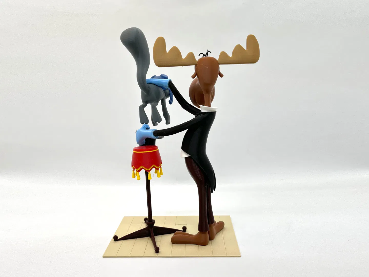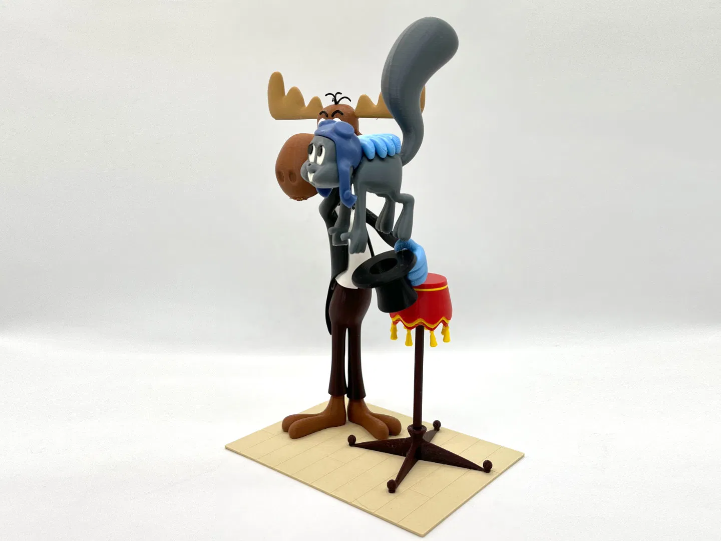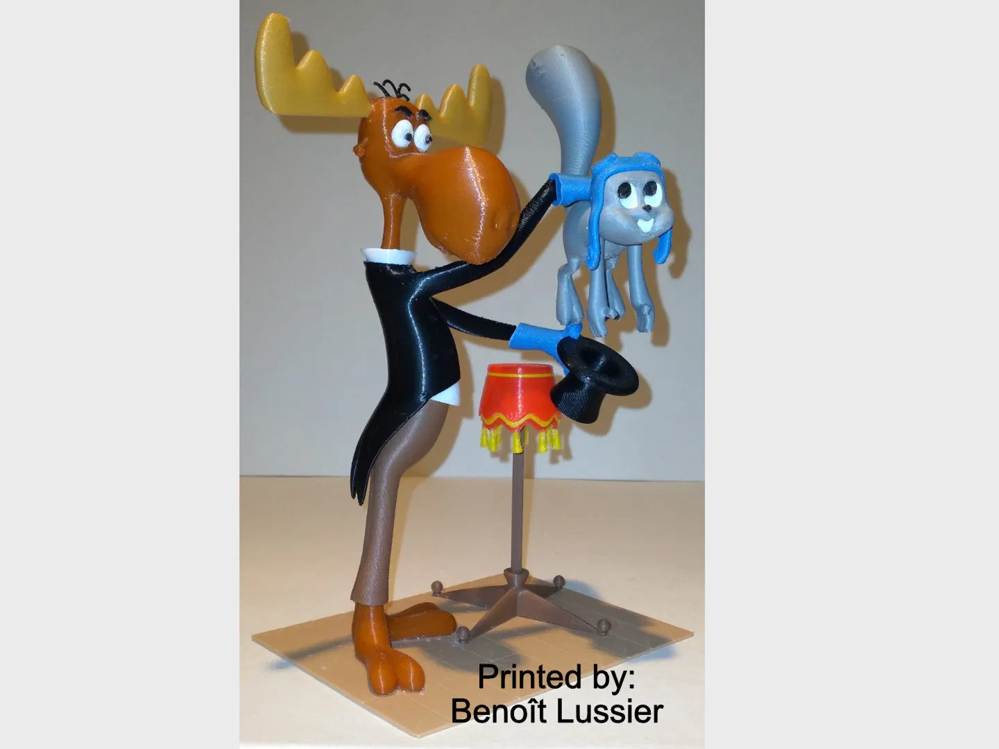 Mô hình 3D Rocky và Bullwinkle lấy cảnh từ short “Hey Rocky Watch Me Pull a Rabbit Out Of My Hat”. Cao 210mm, nhiều chi tiết nhỏ; một số part bắt buộc dùng supports/rafts. Có hướng dẫn in và lắp ráp chi tiết.