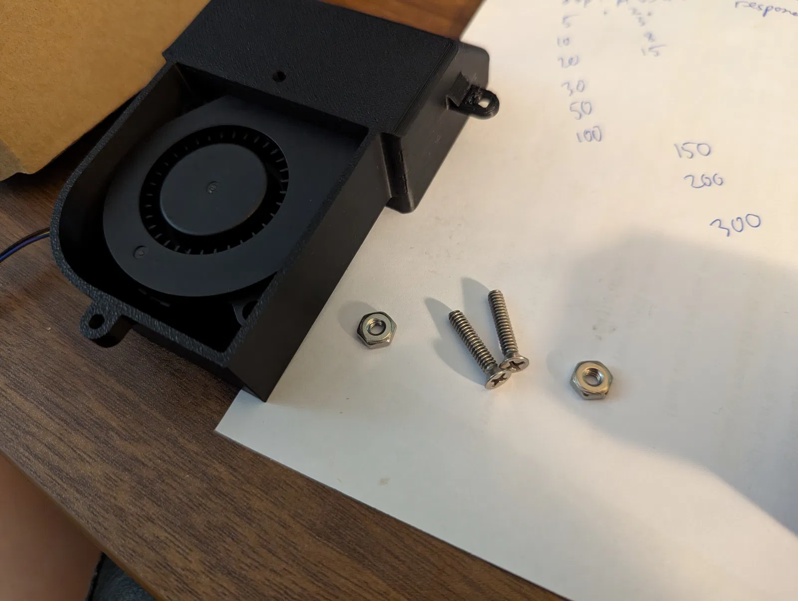 Phần cứng: Mình dùng vít tự ren M3x8mm để bắt các chi tiết lại với nhau và cố định cả cụm vào các lỗ vít trên AD5X. Phần quạt thì mình dùng 2 con vít 6x32, dài 15mm, đầu bằng chìm (flat head counter sunk) kèm đai ốc; nhưng bạn cũng có thể dùng bất kỳ loại vít thường dùng cho quạt case PC tương tự, không cần đai ốc.