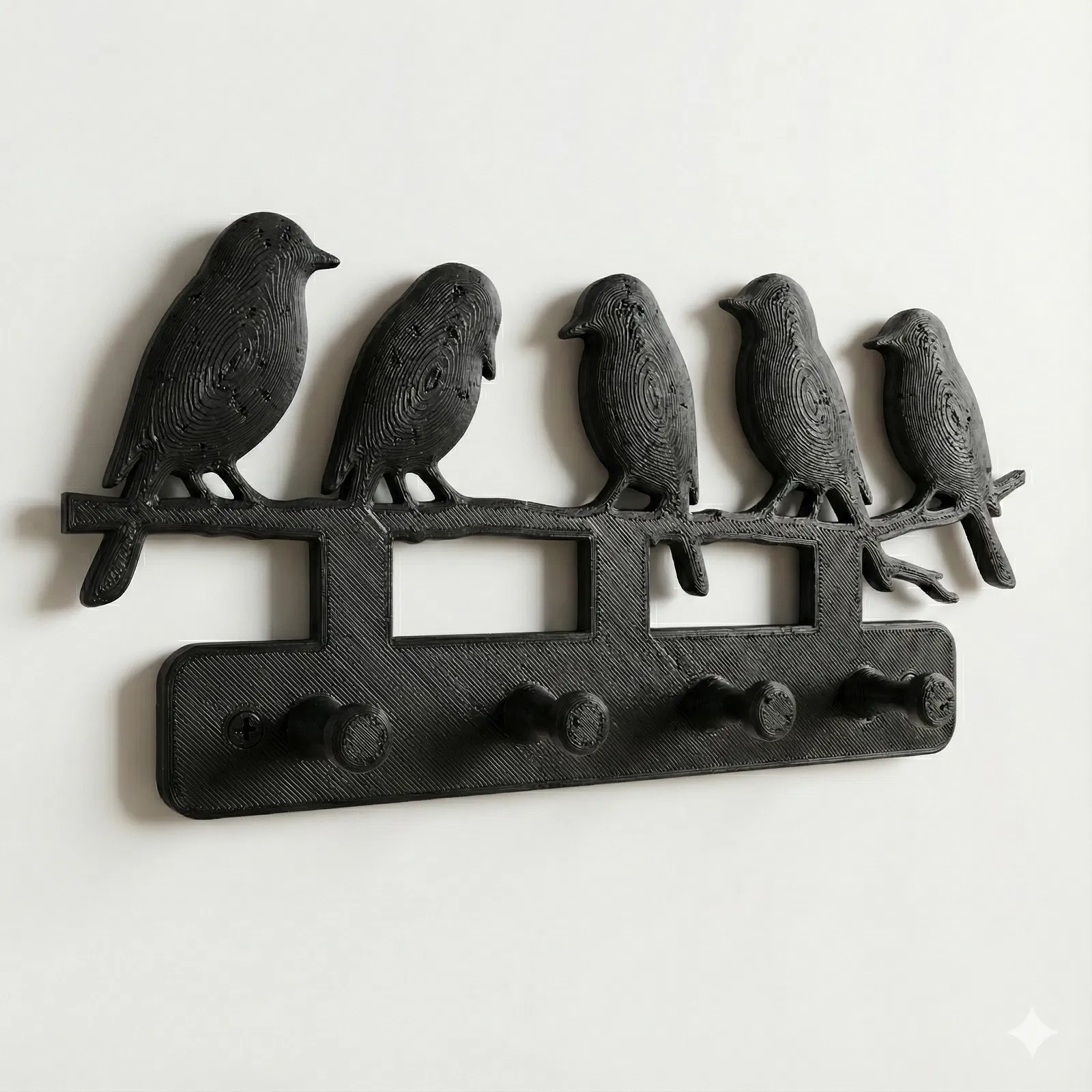 Móc treo chìa khóa gắn tường hình 5 chú chim đậu trên cành, có 4 móc treo chắc chắn. In nguyên khối, không cần supports, phù hợp PLA/PLA+. Gọn nhẹ, đẹp mắt cho lối vào nhà, phòng ngủ hoặc làm quà tặng.