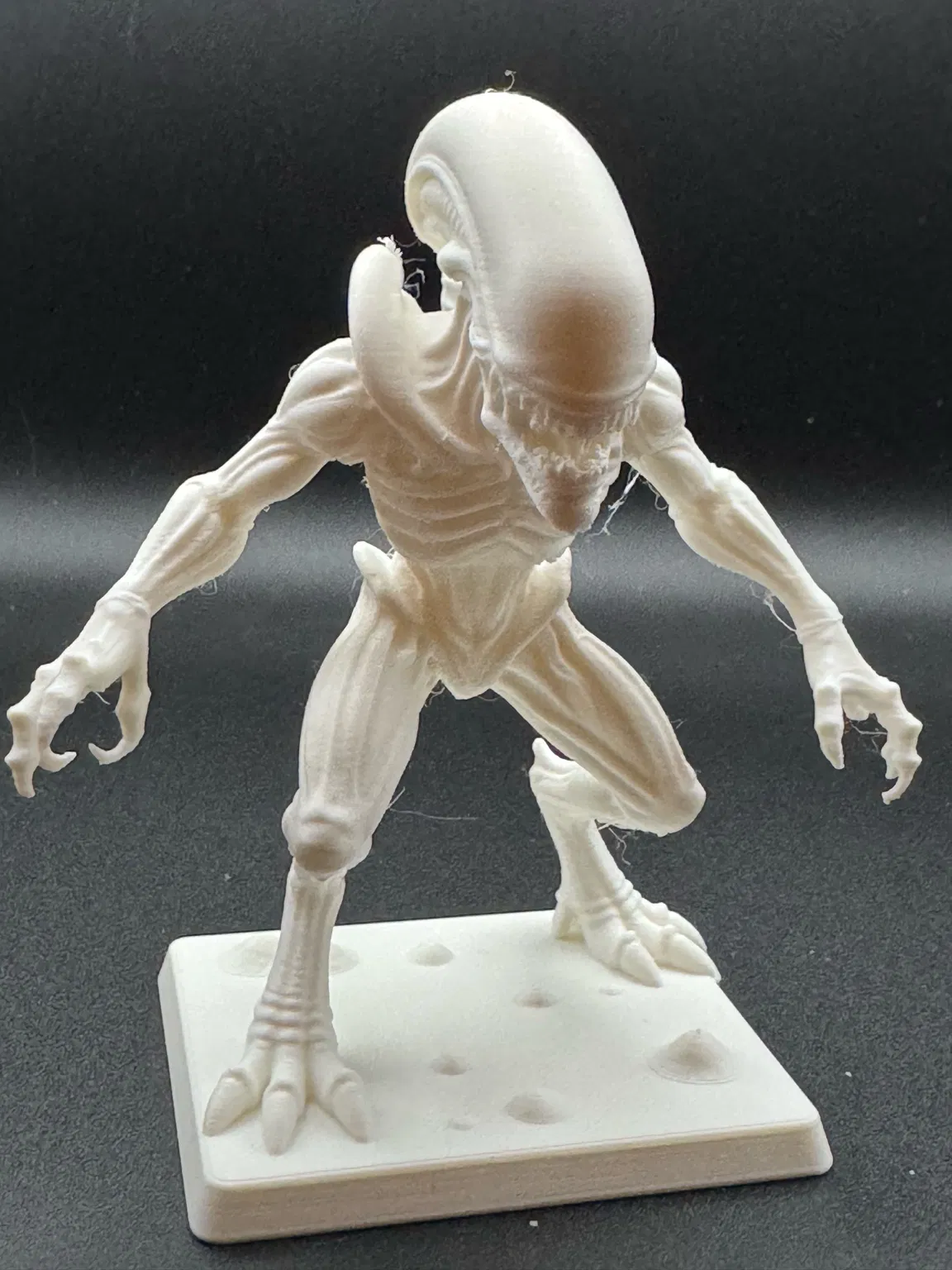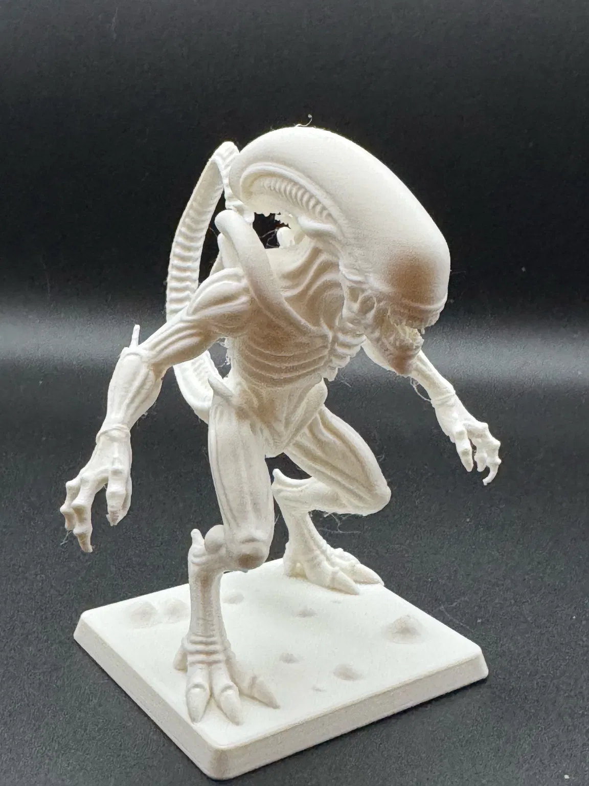 Xenomorfo Alien được in bằng PLA Polymaker Polyterra Cotton White. LƯU Ý: Phần support cần tháo ra thật cẩn thận và nhẹ tay, đặc biệt ở khu vực đuôitay để tránh bị bong/tách chi tiết. Nên dùng dụng cụ phù hợp như kềm và kềm cắt (đồ nghề model). Chúc bạn in đẹp và chơi vui.