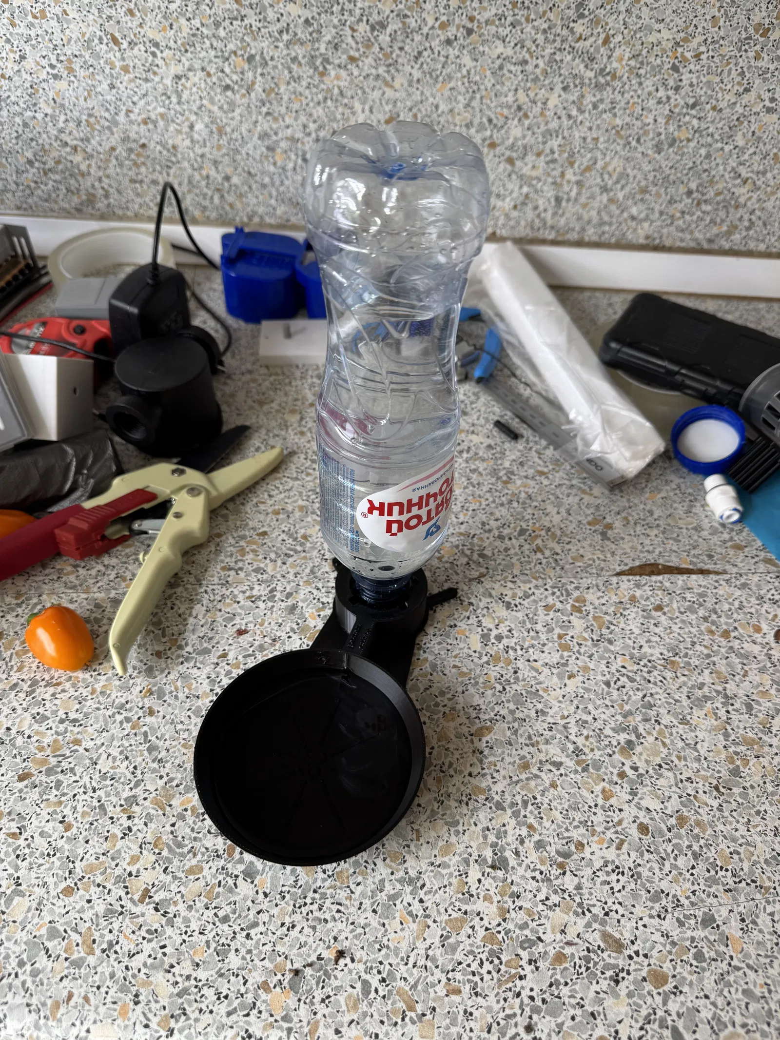 Lưu ý: không phải chai lớn nào cũng hợp, chỉ dùng loại chai nhựa cứng (chai nước khoáng) — chai KHÔNG được bị bóp xoắn, phải giữ form. Nhớ kiểm tra trước khi dùng chai mới để tránh sự cố!