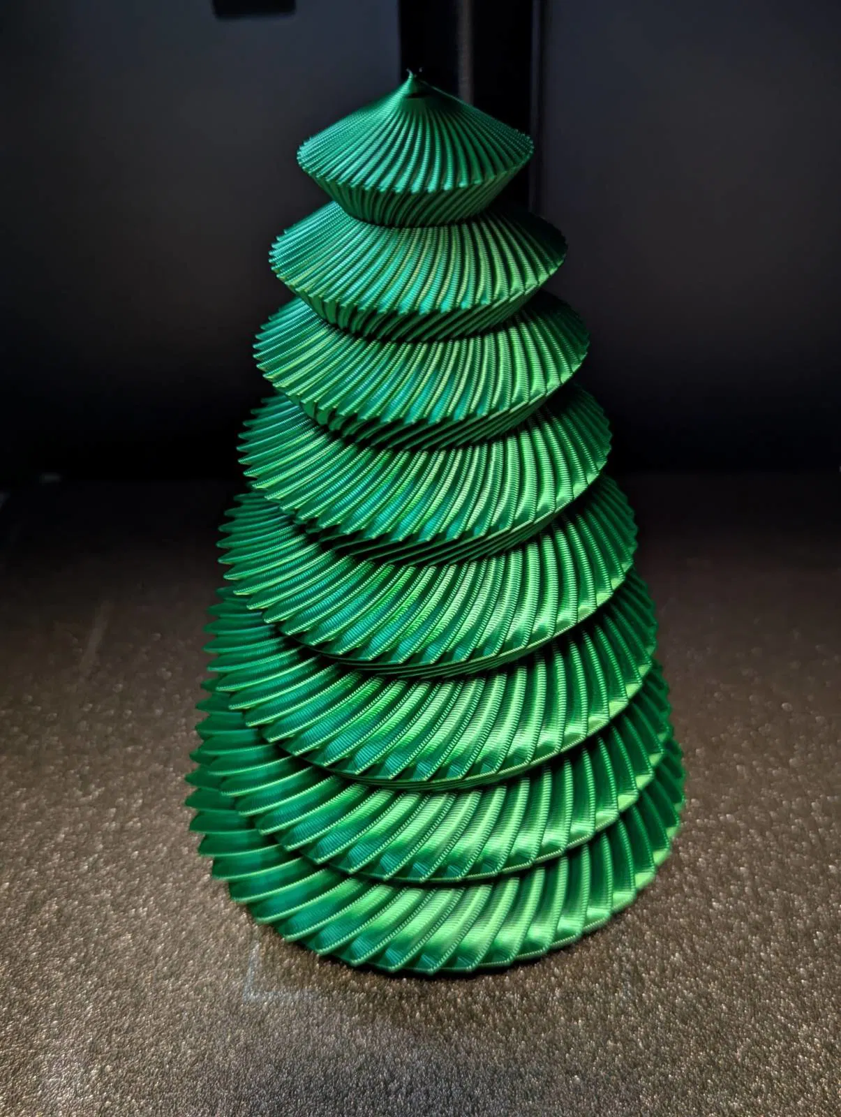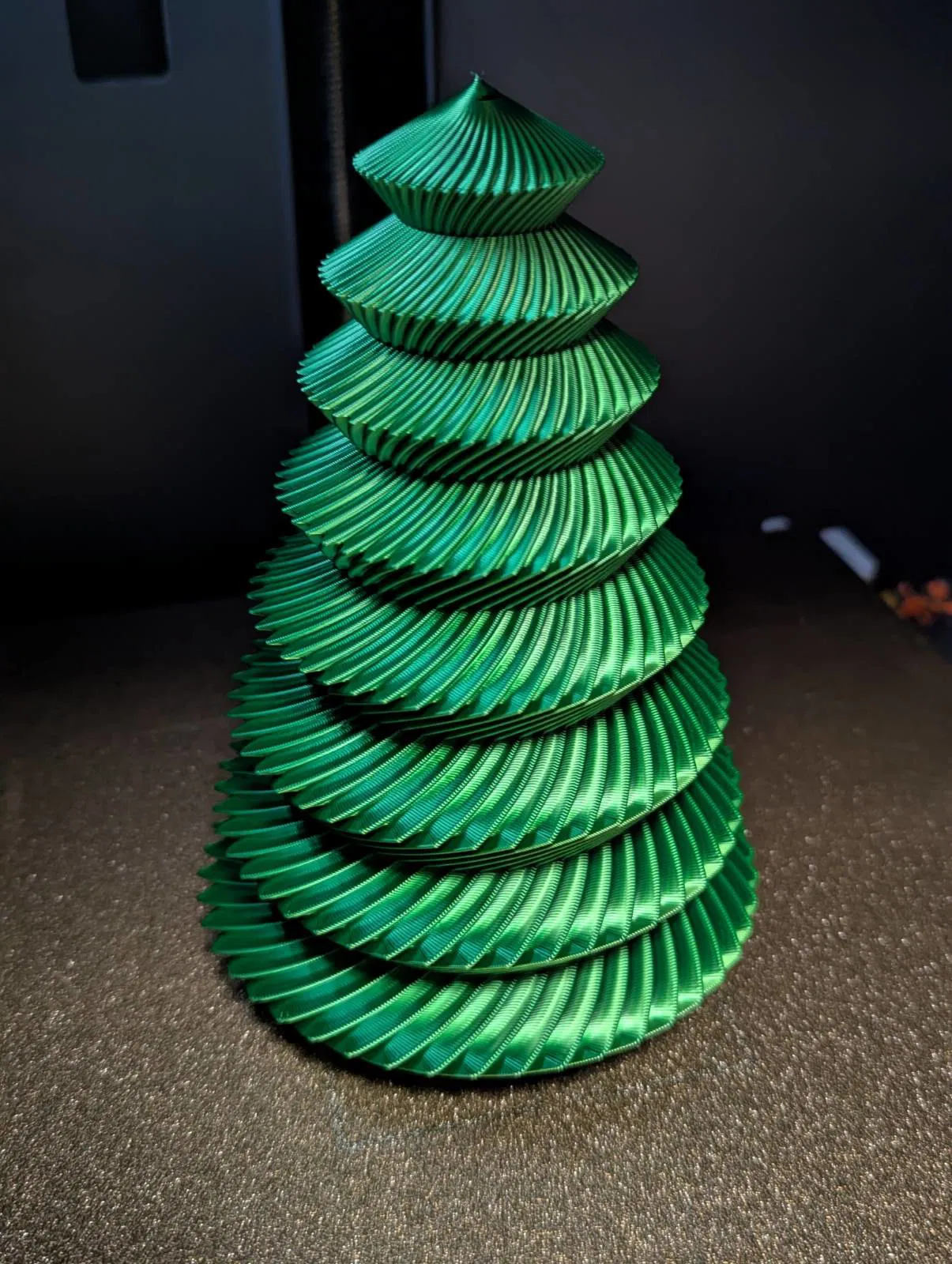Mẫu cây thông Noel in siêu nhanh bằng chế độ vase mode. Khuyến nghị dùng filament silk xanh lá và line width 0.5mm để ra bề mặt đẹp, in ổn định. Đừng quên đăng make để mọi người cùng xem nhé!