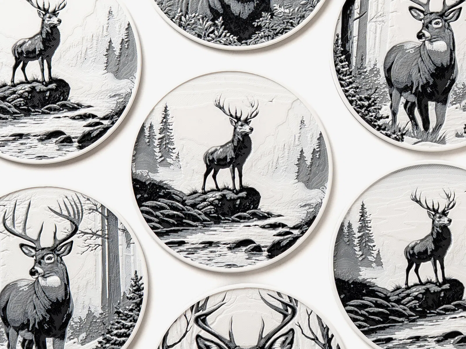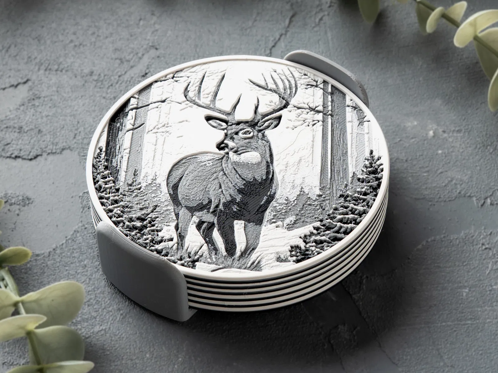 Bộ lót ly Winter Deer Coasters khắc họa một chú hươu hoang dã dạo bước trong khu rừng mùa đông tĩnh lặng. In không cần AMS/MMU, chỉ 2 lần đổi màu; kèm 3MF cho AMS và hướng dẫn in thủ công.