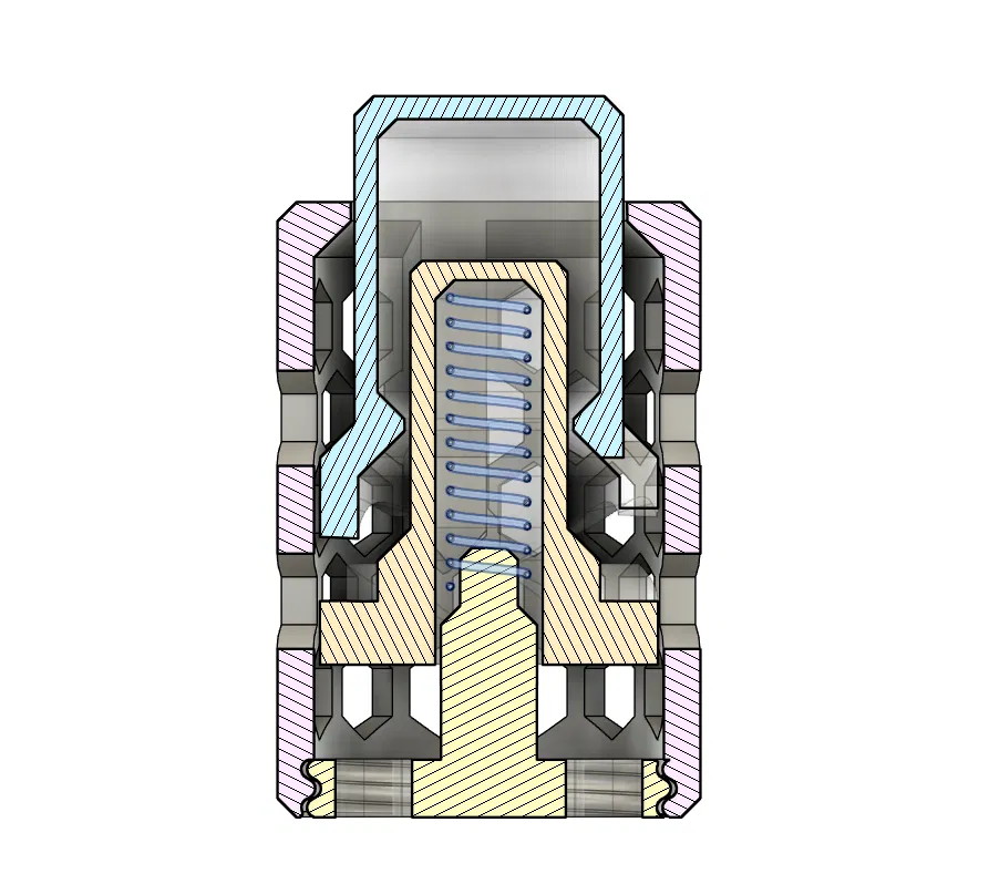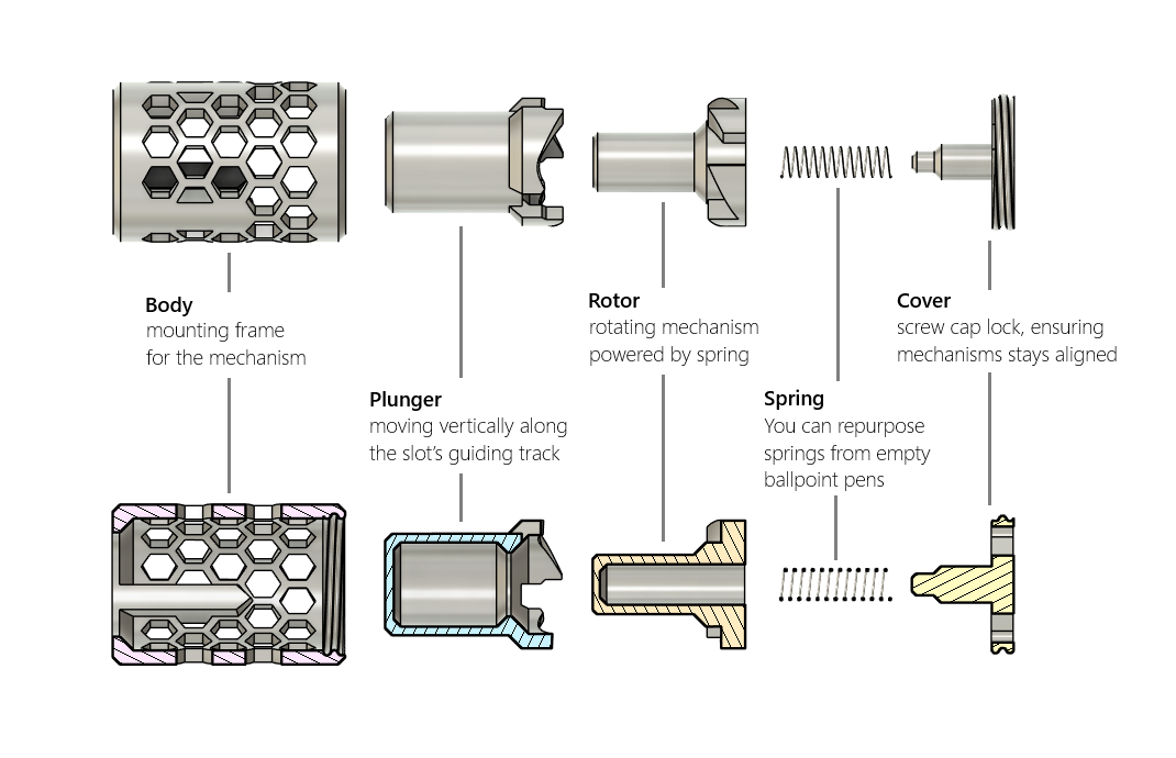 Một món fidget toy gây nghiện, dựa trên cơ chế của bút bi bấm (thường gọi là click mechanism), thường gồm có lò xo (spring), cam và ty đẩy (plunger). Khi bạn bấm nút, plunger sẽ di chuyển, làm cam xoay và khiến cơ cấu thò ra hoặc thụt vào. Lò xo tạo lực hồi để rút về. Lúc bạn thấy căng thẳng hay chỉ cần “nghỉ não” nhanh một chút, cứ bấm cái “tách”, nhấn cái “cạch” và để chuyển động có lò xo đó làm dịu bớt áp lực. Kiểu như một “trợ thủ” xả stress vậy.
