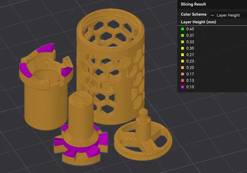 - Để rotor chạy mượt hơn, có thể dùng adaptive layer height để tăng độ mịn bề mặt ở một số khu vực cần thiết.