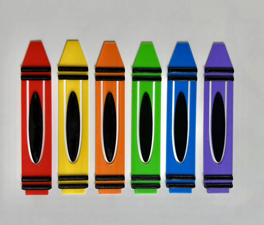Bộ bookmark chủ đề tựu trường gồm trái táo, xe buýt trường học, trang giấy vở và bút sáp màu. In FDM với PLA, print in place, có thể thêm màu trong slicer. Dày 1–3mm, cao 110–130mm.