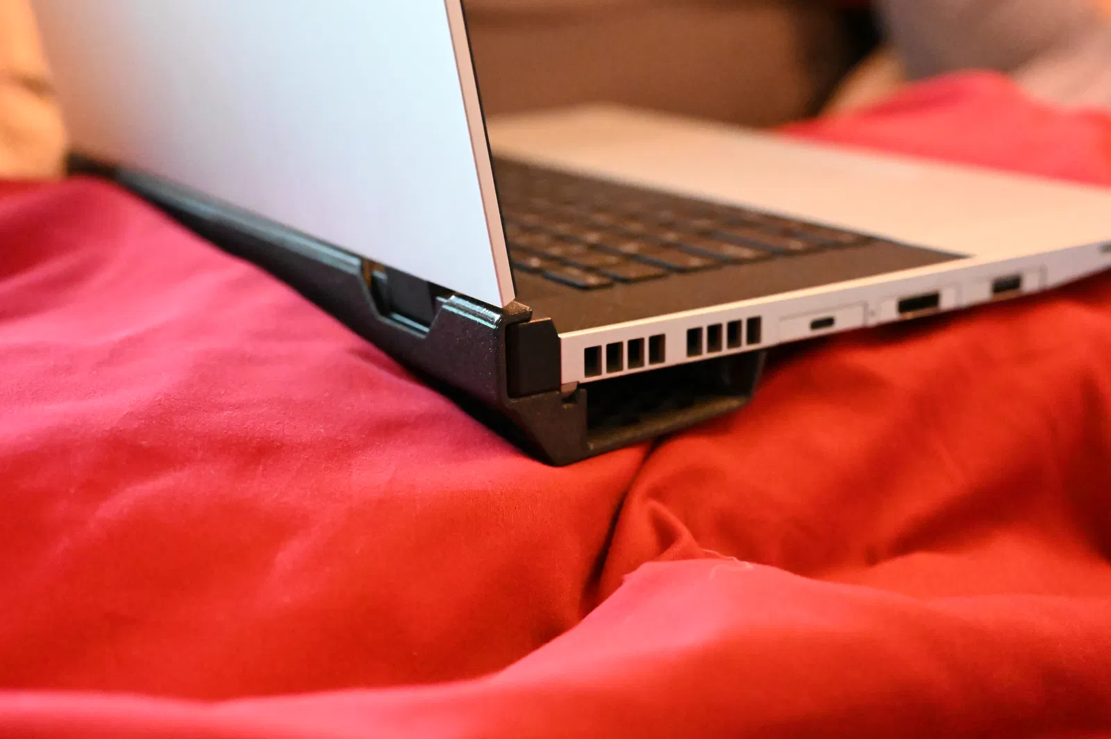 Nếu bạn hay ngồi đặt laptop lên một cái chăn xù mềm mềm, có thể bạn sẽ lo máy hút phải sợi vải hoặc khe hút gió bị che mất. Tương tự, khi để laptop trực tiếp lên đùi, sau một lúc làm việc nặng bạn có thể thấy chân bắt đầu nóng và đổ mồ hôi.