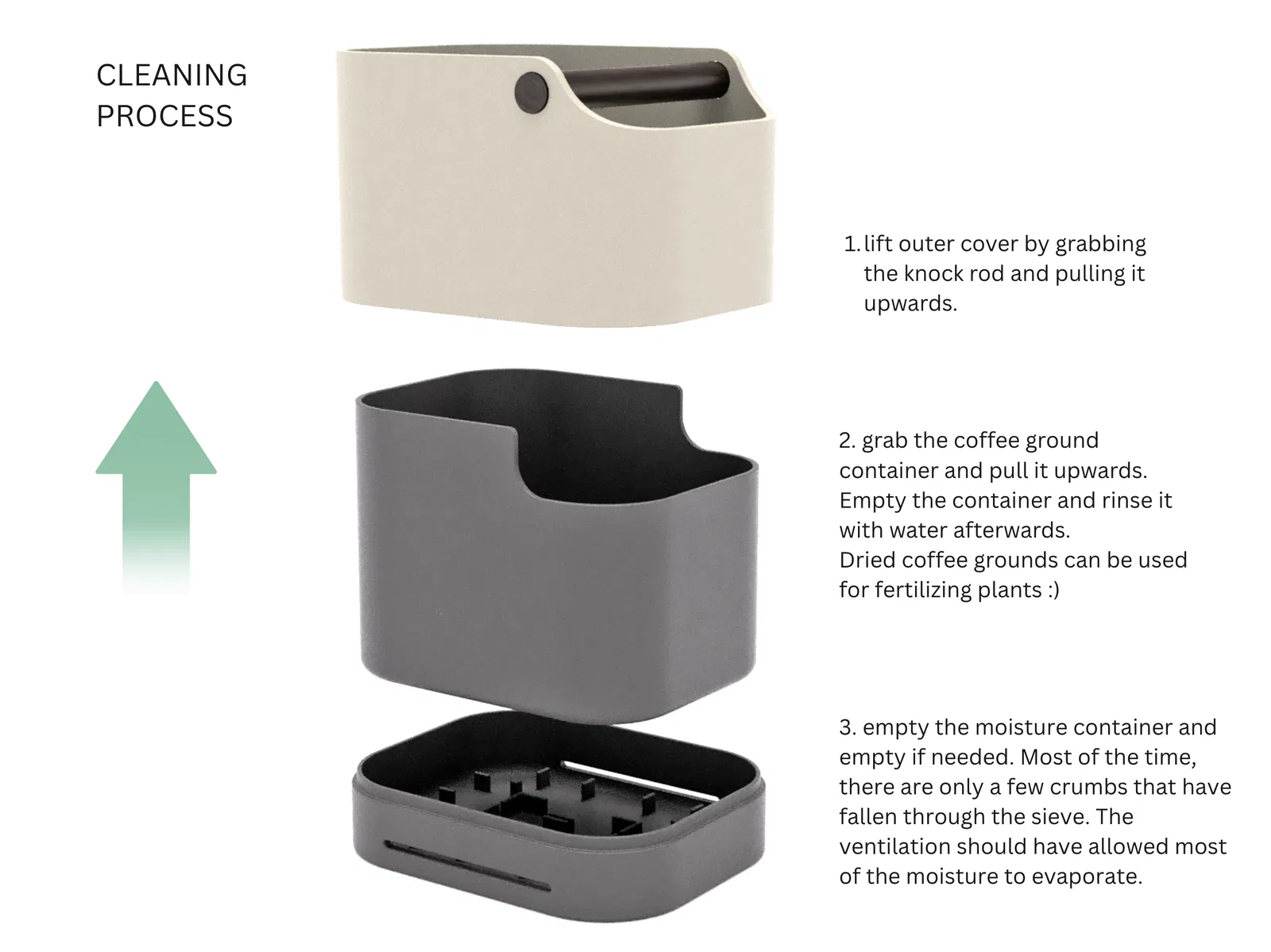 Bên dưới còn có một hộp nhỏ khác, hai bên có các khe thông gió. Hộp đựng bã cà phê có tích hợp sẵn một cái rây (sieve) giúp không khí lưu thông qua các khe thông gió và qua rây, đảm bảo bã cà phê còn ẩm có thể khô đúng cách và hạn chế bị mốc. Bạn có thể in từng phần với bất kỳ màu nào bạn thích.