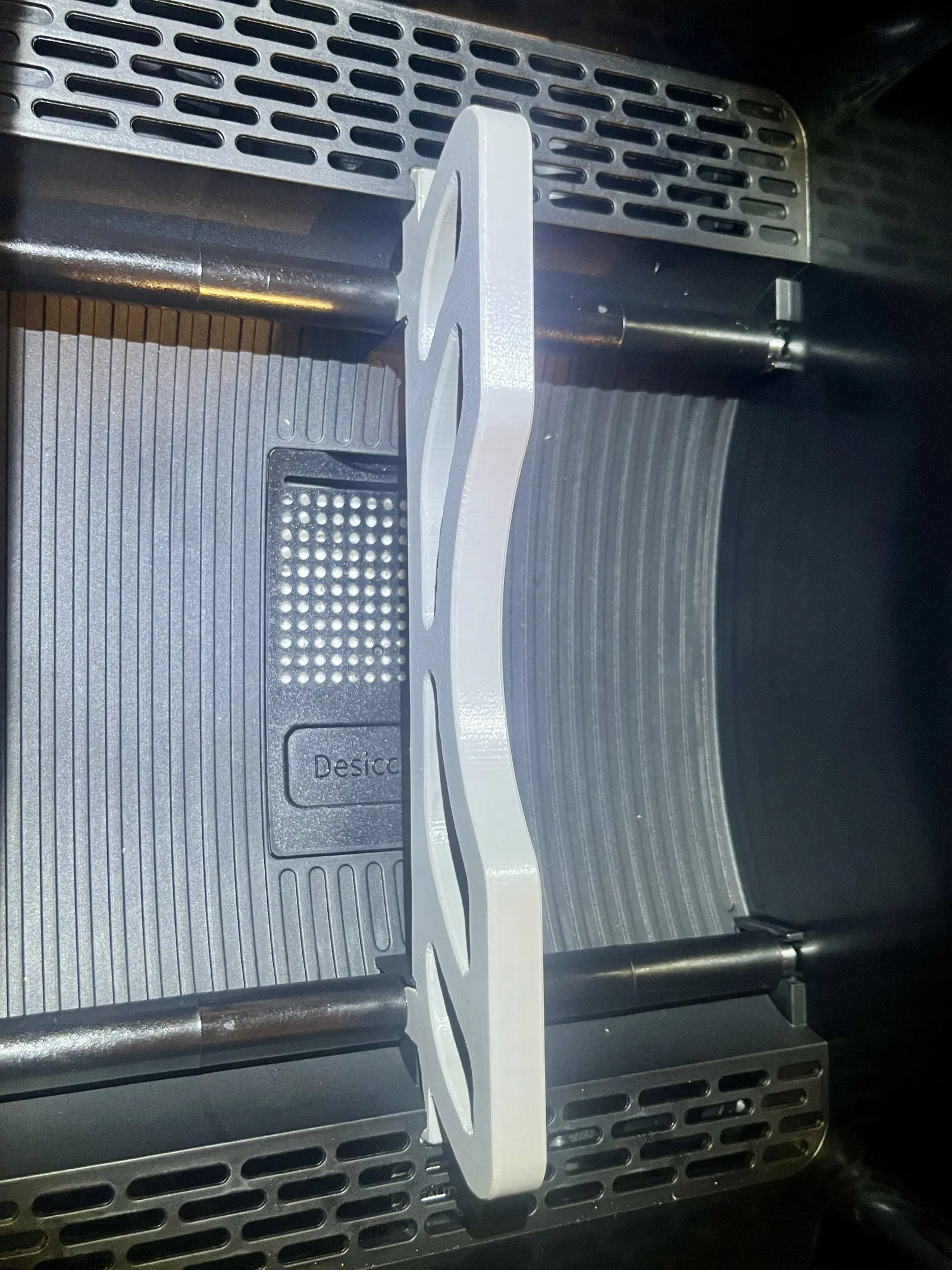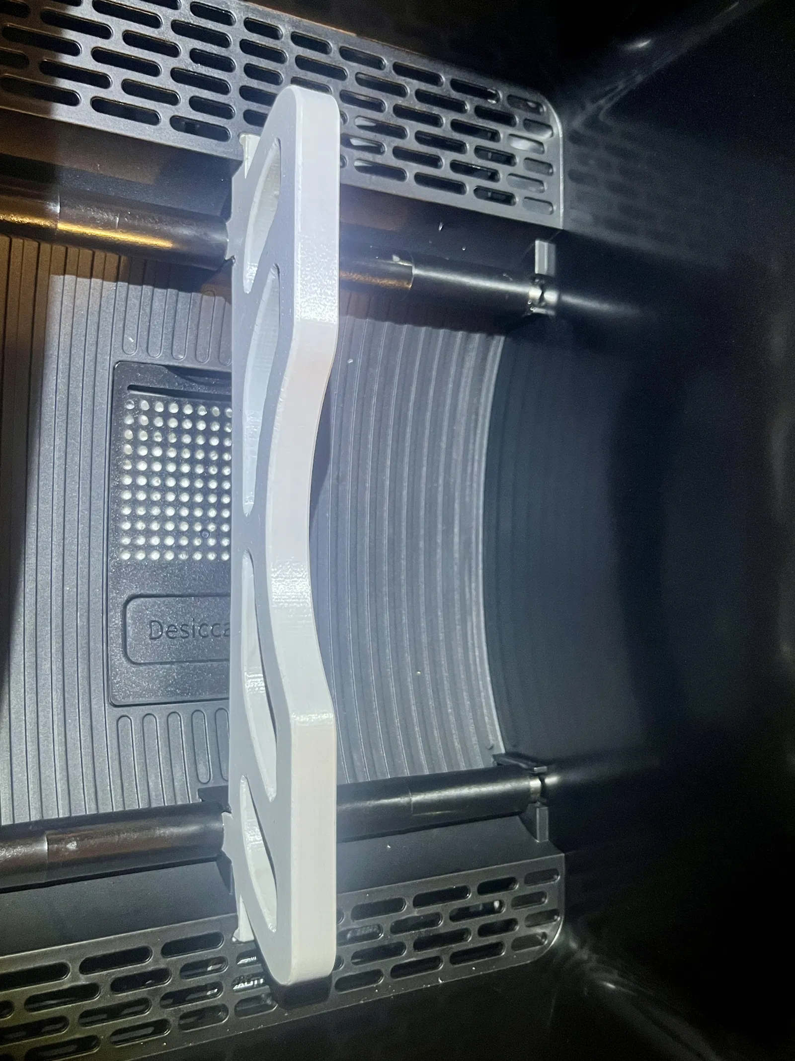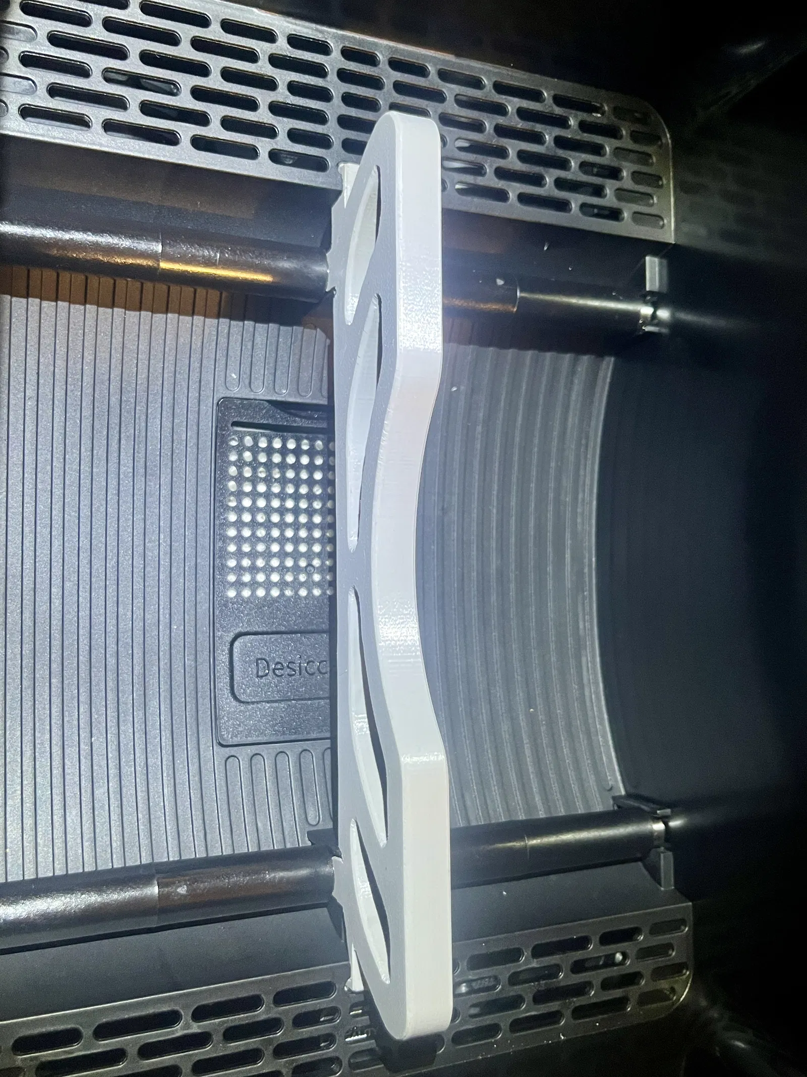 Mình đã gặp tình trạng này vài lần: spool gần hết bị kẹt trong máy sấy ngay lúc đang in, làm phát sinh lỗi in. Nên mình tìm một giải pháp đơn giản, không cần phải gắn thêm tạ/spool weight. Vì lúc đó trên thị trường chưa có món nào phù hợp, nên mình tự thiết kế luôn.