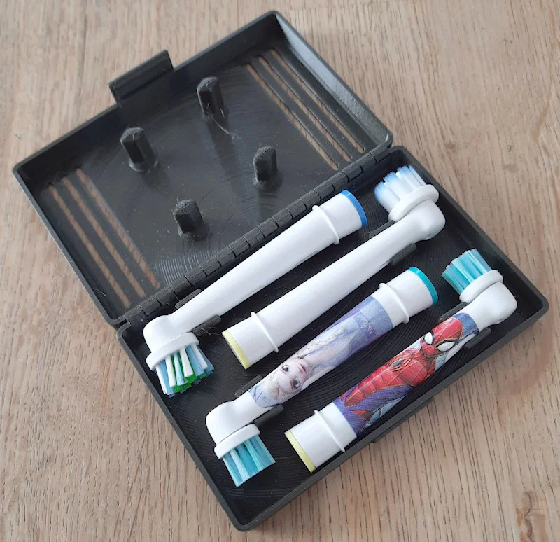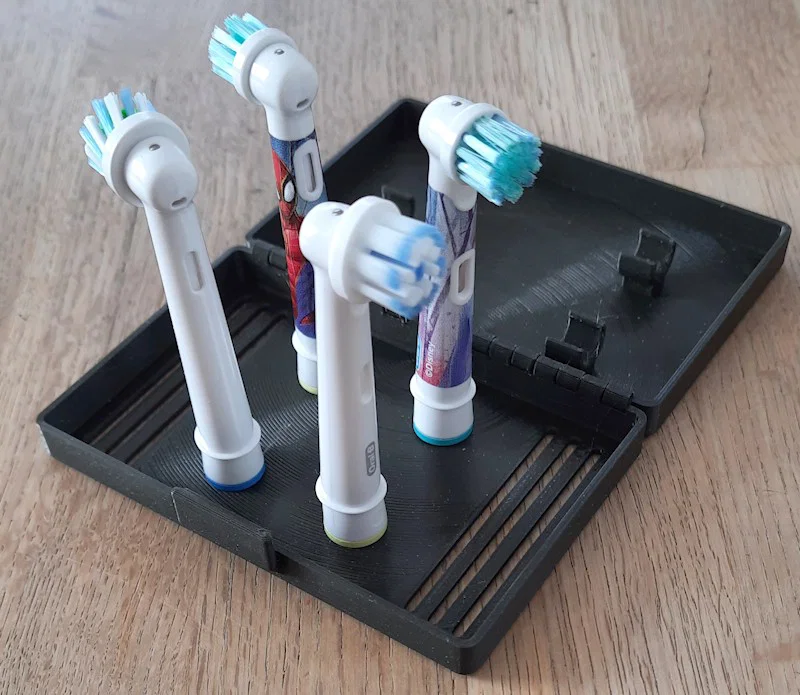 Hộp du lịch print-in-place cho 2/4/6 đầu bàn chải Oral-B (Vitality/Pro/Smart…, không dùng cho iO/Pulsonic), có sẵn chân đế tương ứng. In không cần support; có bản -widetol và miếng test để kiểm tra bản lề.