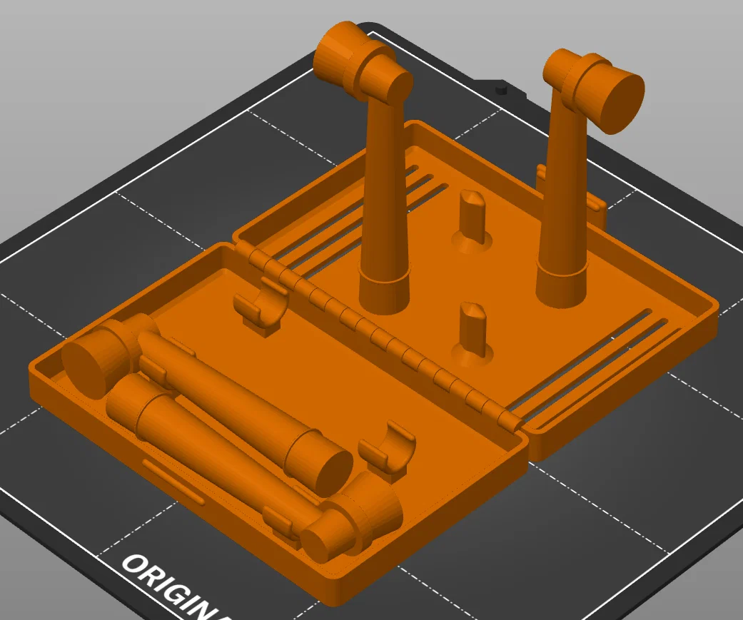 Hộp du lịch print-in-place cho 2/4/6 đầu bàn chải Oral-B (Vitality/Pro/Smart/…, KHÔNG phải iO/Pulsonic), kèm theo 2/4/6 chân đế. Trước giờ mình chỉ để dựng đứng ở đâu đó cho cẩn thận thôi, mà tụi nó hay bị ngã. Mình đã làm vài phiên bản chốt đỡ (có cả bản theo đúng biên dạng thật), nhưng với thiết kế gọn gàng này thì mình chọn kiểu chiếm ít chỗ hơn một chút, và quan trọng hơn là dễ vệ sinh hơn. Bản 4 đầu đã được cập nhật so với bản trong hình để có các khe thoáng ngắn hơn, cứng hơn (giống bản 6 đầu).