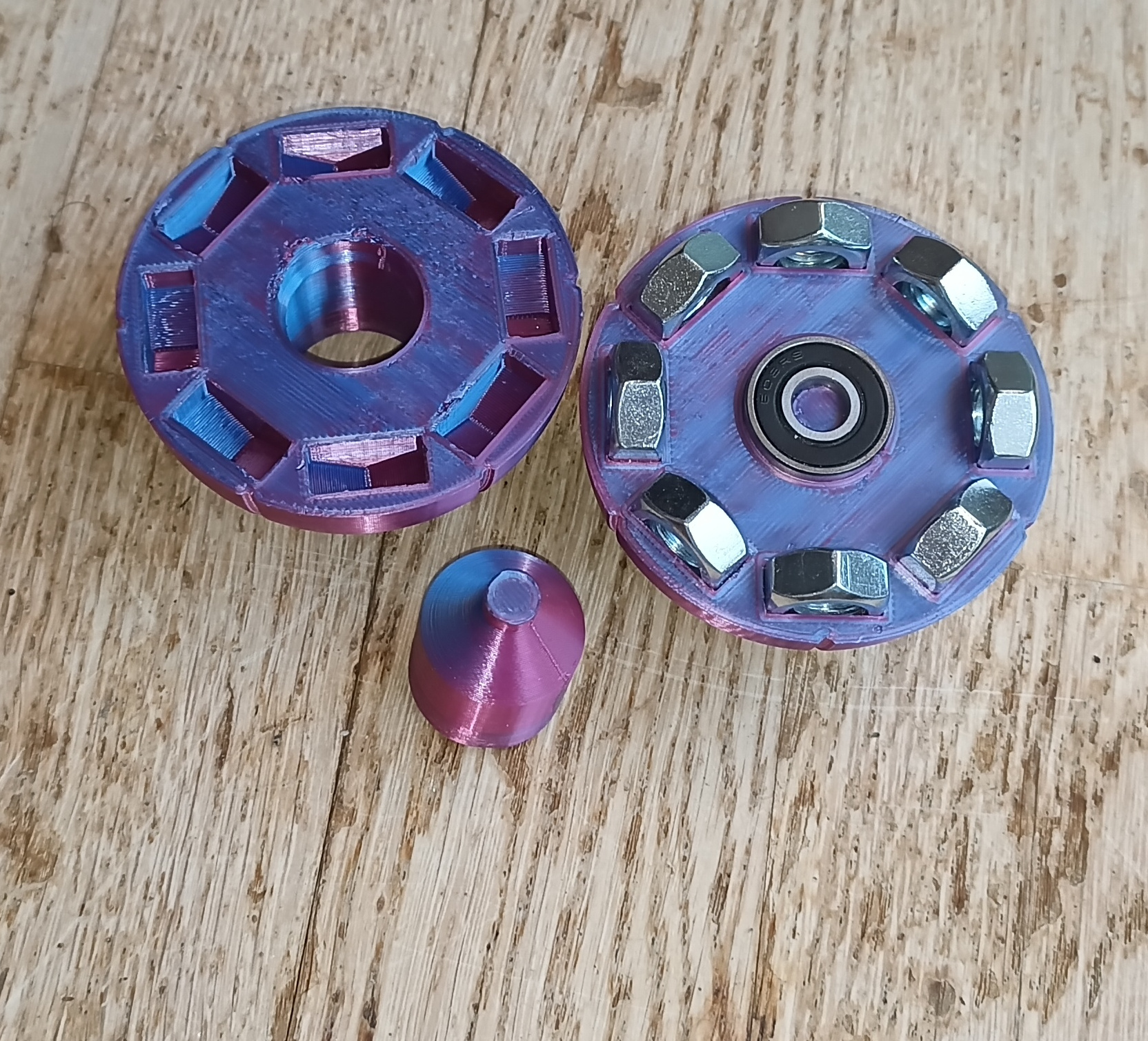 Đồ chơi fidget lấy cảm hứng Steel Ball của Gyro Zeppeli: dùng 1 vòng bi 608 ở tâm và 8 tán M10 để canh khớp, tăng quán tính. In một lần với PLA, variable layer height, infill 15% trở lên cho đầm tay.