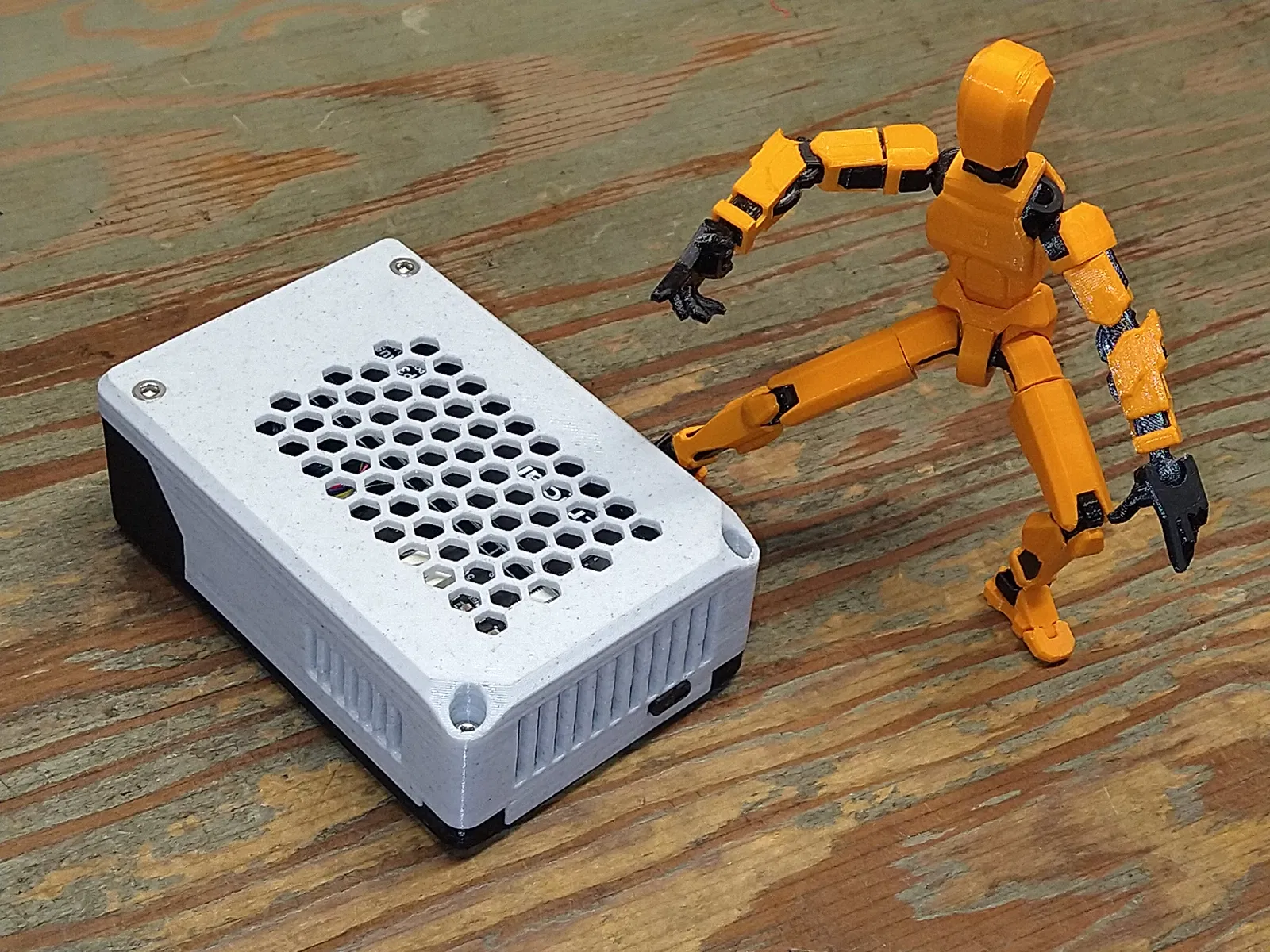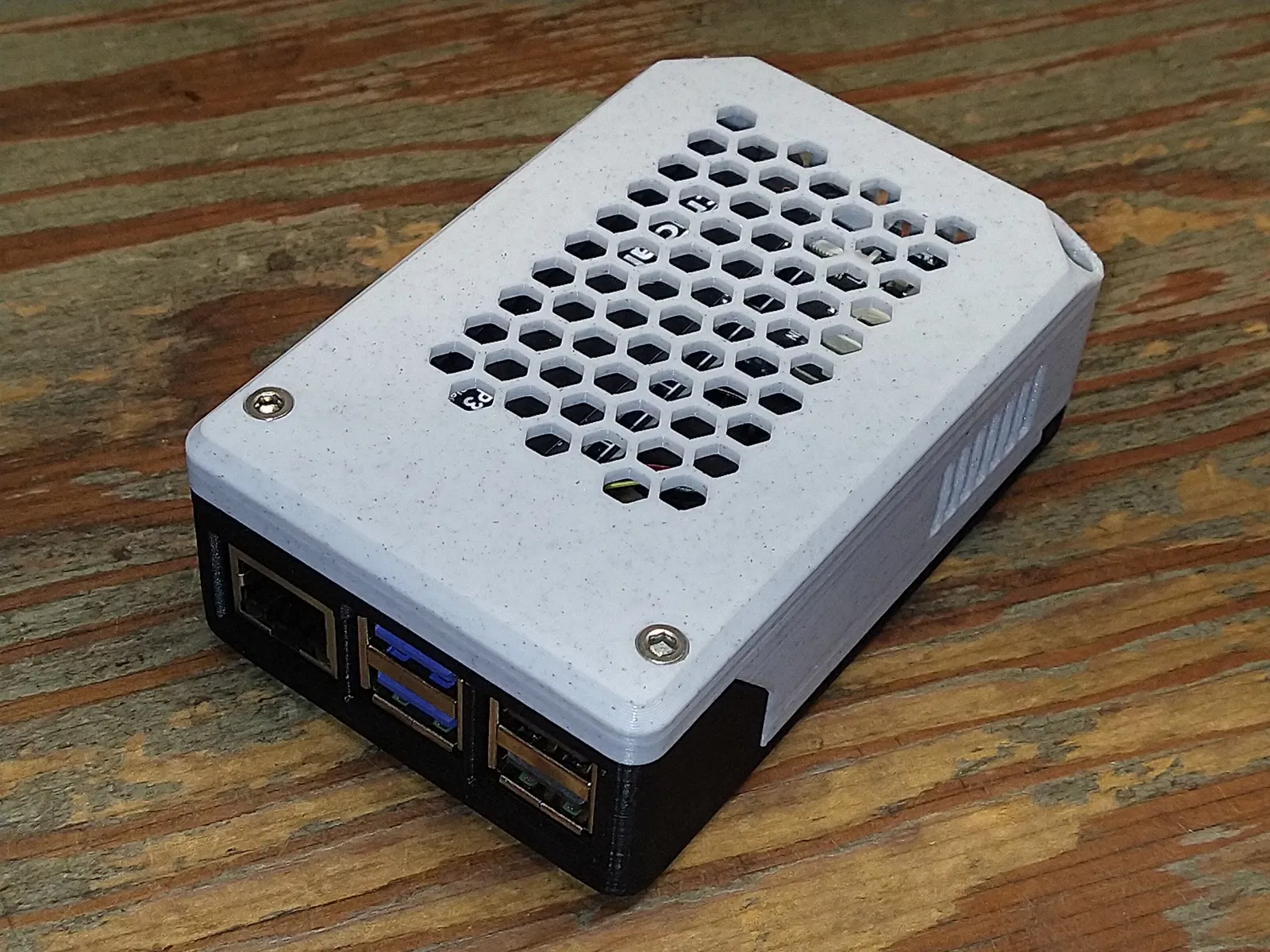 Nút nguồn có một lỗ có thể đổ keo nến (hot glue) vào để làm ống dẫn sáng, giúp nút hiển thị trạng thái hiện tại của hệ thống. *Nhớ gắn nút từ phía bên trong vỏ trước khi đặt bo mạch Raspberry Pi vào.