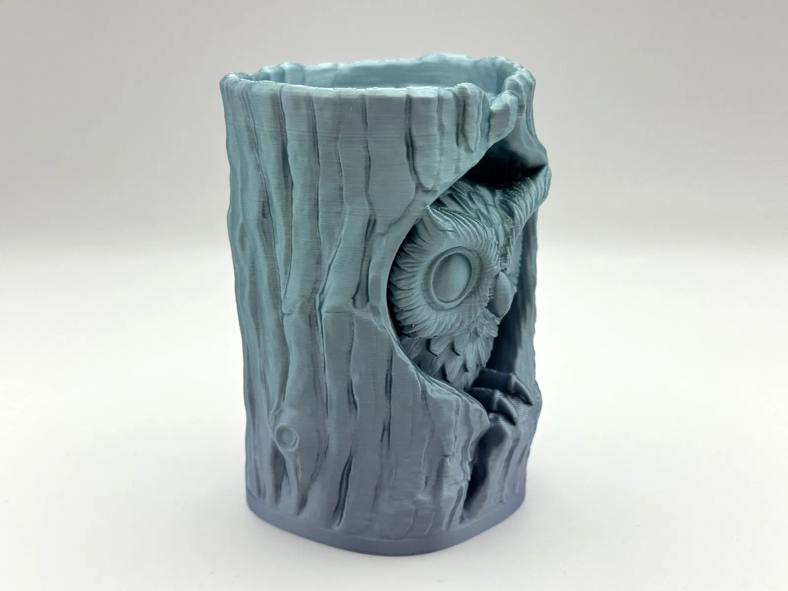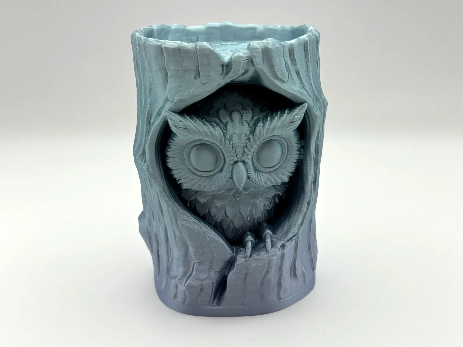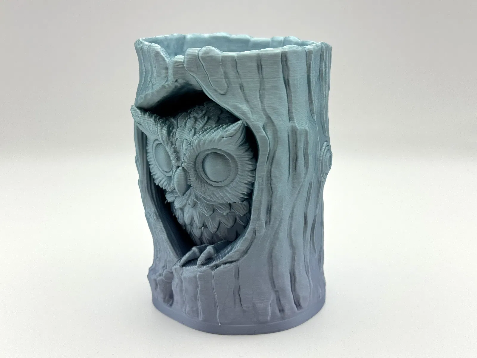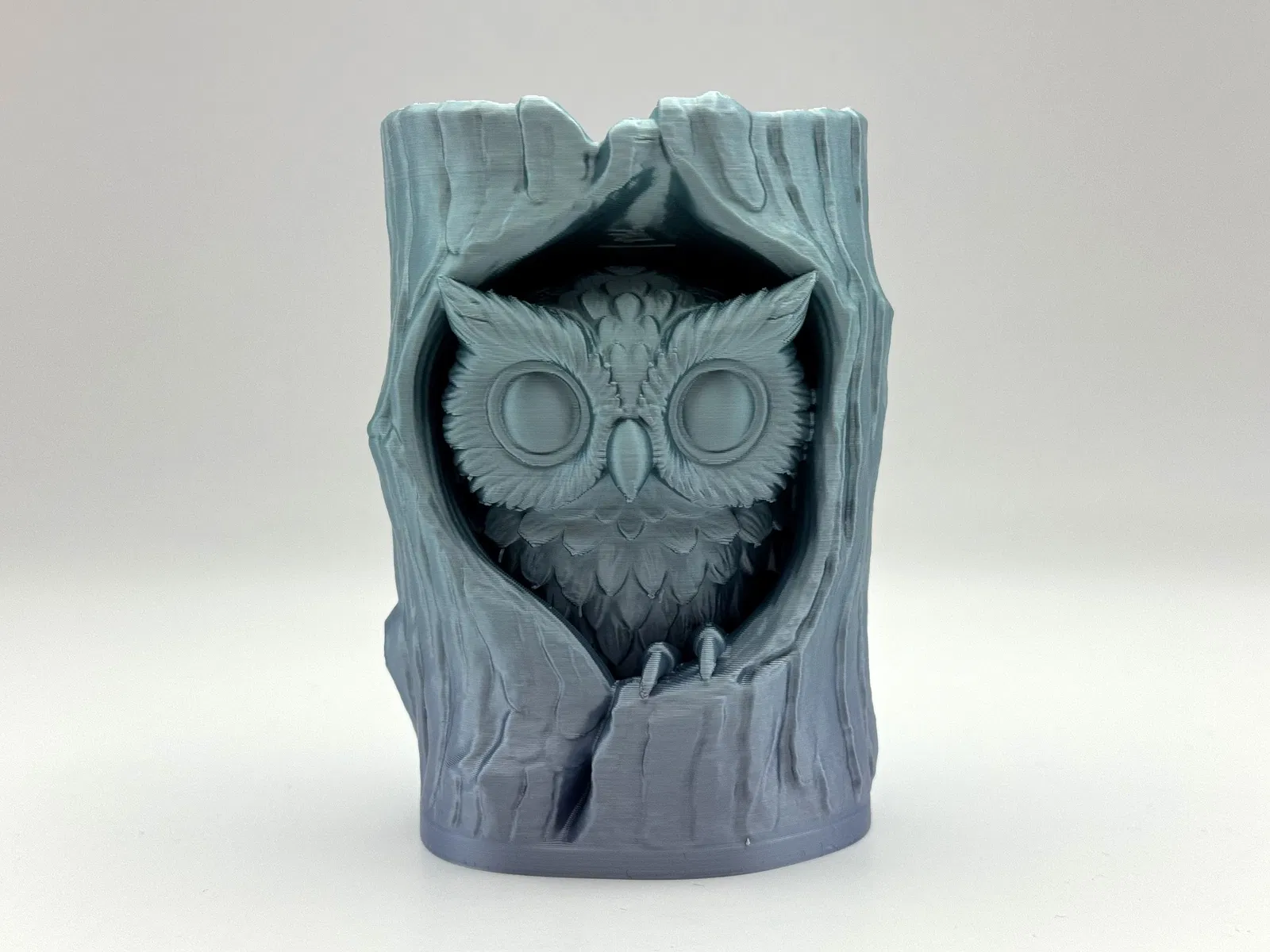 Mô hình Owl in Log Figure chi tiết, chú cú nhỏ nằm trong thân cây rỗng, hợp trang trí kệ sách hoặc sân vườn theo phong cách rừng xanh/fantasy. In 3D cần ít supports; supports kiểu organic dễ bóc sạch.