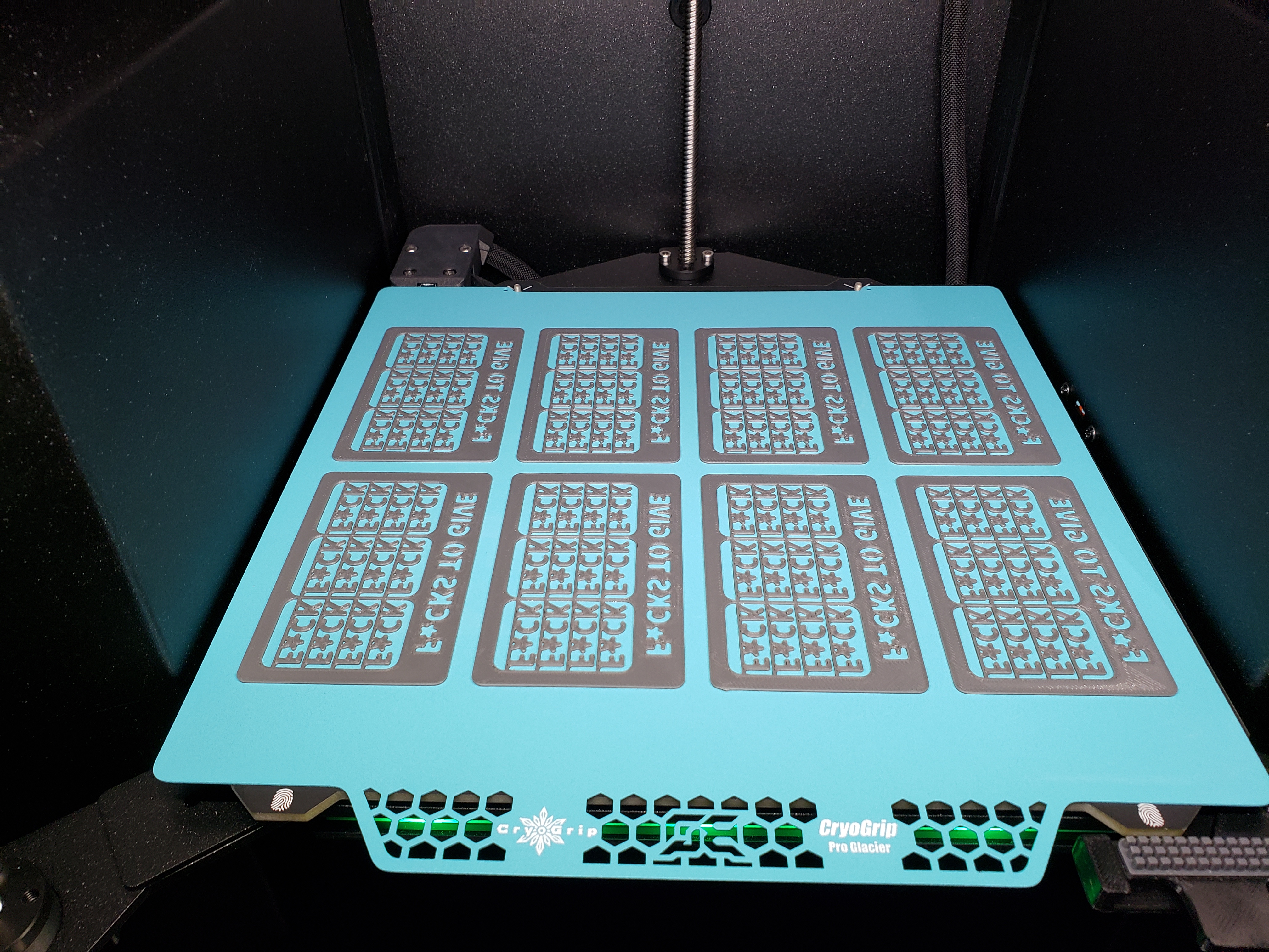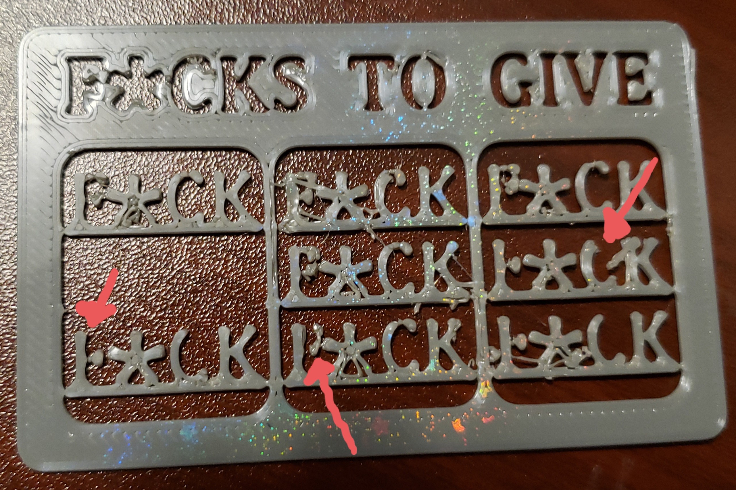Mình in bản gốc cho sinh nhật một bạn đồng nghiệp, bạn ấy khoái lắm. Sau đó mấy đồng nghiệp khác hỏi mình lấy cái thẻ này ở đâu để họ kiếm vài cái cho họ và bạn bè. Mình bắt đầu in thêm cho họ bằng PLA rẻ tiền, nhưng rồi thấy có vấn đề. Ở phần cuối của chữ “F” và “C” có vài đoạn chỉ dính với nhau bằng một vách mỏng đơn, nên đôi lúc bị gãy rớt. Mình cũng gặp tình trạng các góc chữ bị bong/nhấc lên trong lúc in.