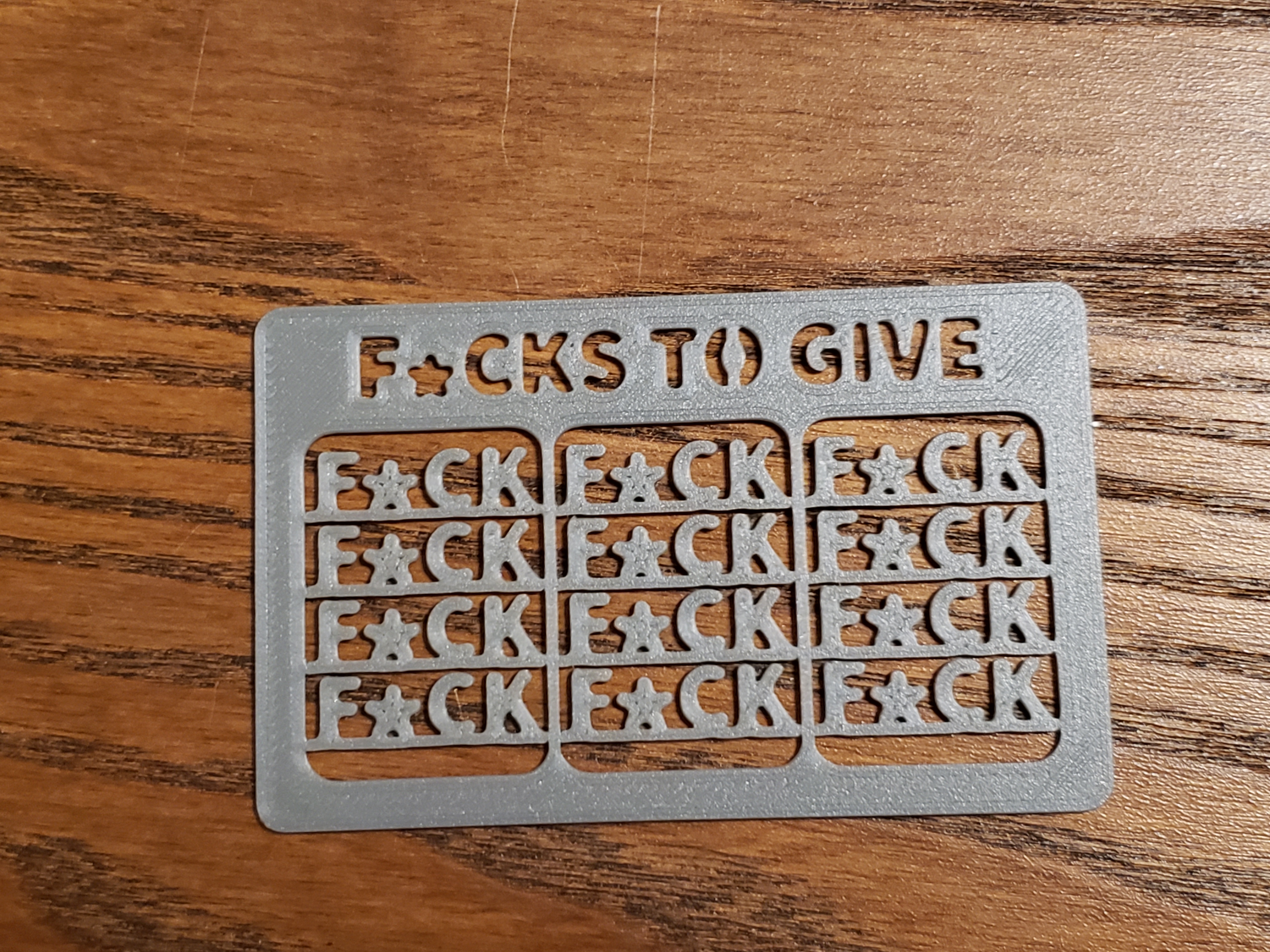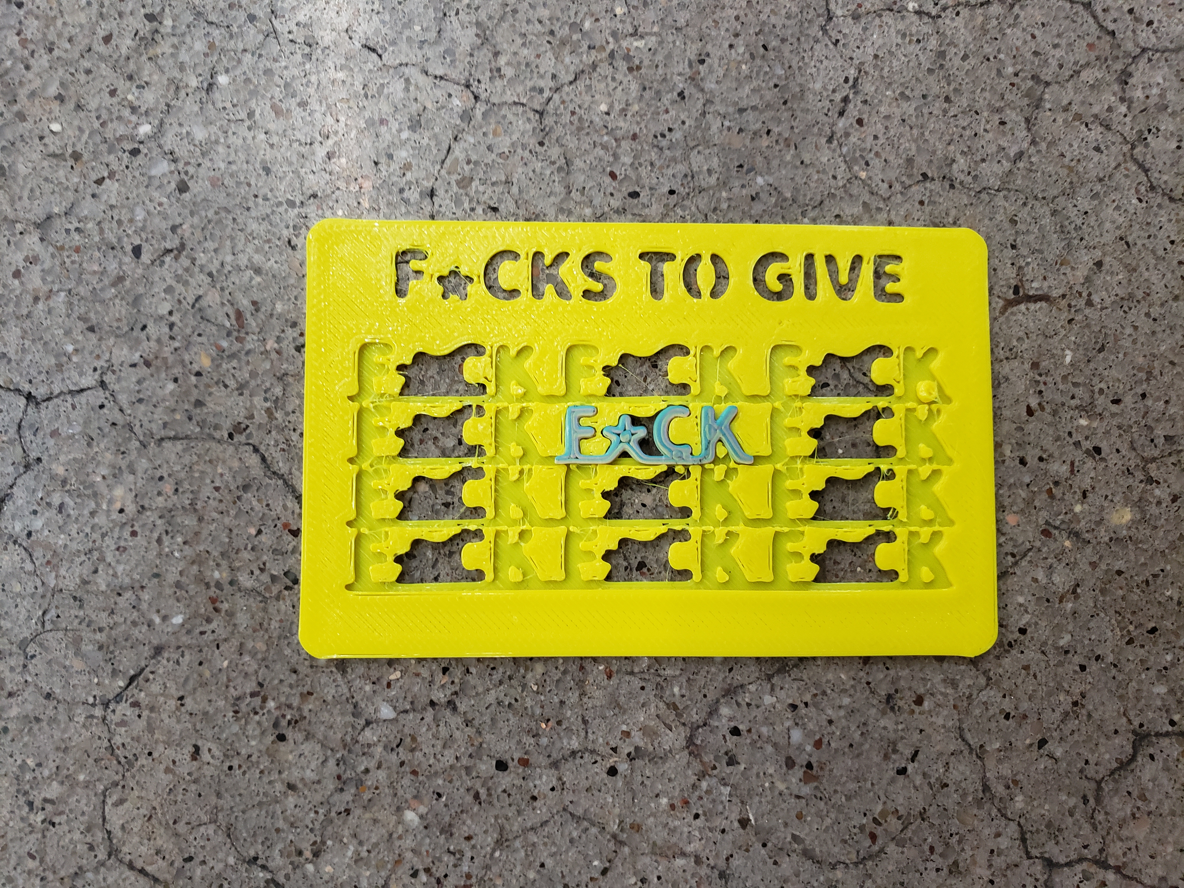 Thẻ “Fs to Give” bản remix dễ in hơn: chữ dày đều, hạn chế gãy phần mảnh và giảm bong góc khi in với PLA rẻ. Thêm 3 F trên thẻ, có bản trống và collector’s edition để nhét F đã punch lại vào.