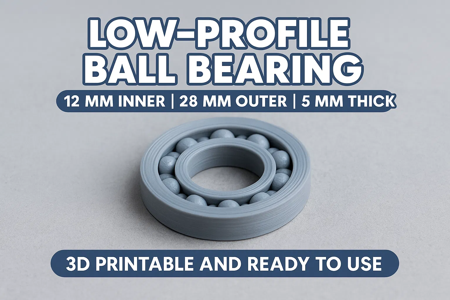 Vòng bi (bearing) cơ bản dùng cho in 3D: đường kính trong 12mm, đường kính ngoài 28mm, dày 5mm. Quay mượt, thường in FDM không cần support. Khuyên dùng PLA hoặc PETG và canh fitment cho chuẩn.