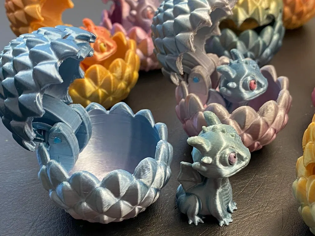 Hộp nhỏ hình trứng rồng có vảy, bản lề và chốt gài bấm đóng kín. Bản remix được gia cố để bền hơn, nhất là khi in bằng Silk PLA vốn bám lớp kém. Kèm hướng dẫn supports, in 3mf và lắp ráp.