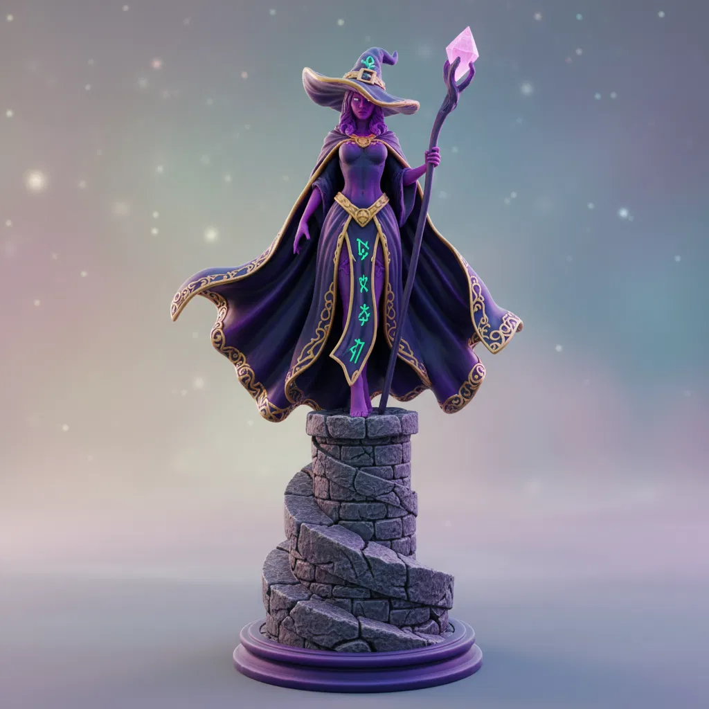 Một phù thủy dáng cao đứng trên phần đế tháp đá xoắn ốc, áo choàng quấn chặt quanh người. Tượng liền khối (one-piece) dành cho in 3D.