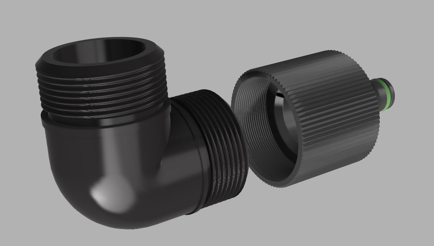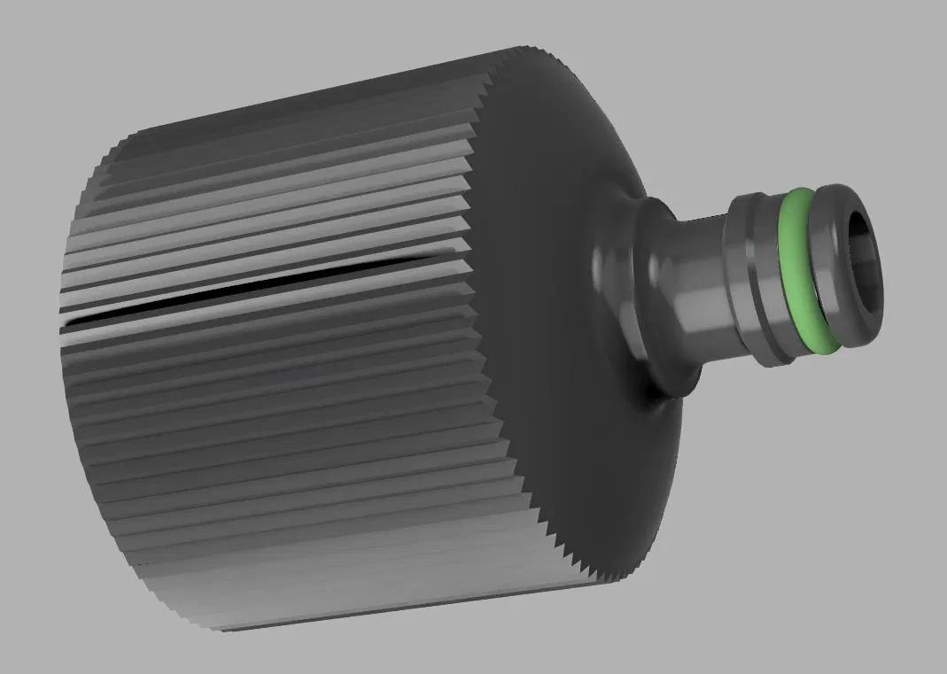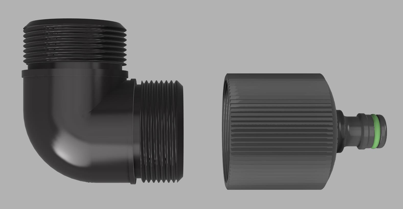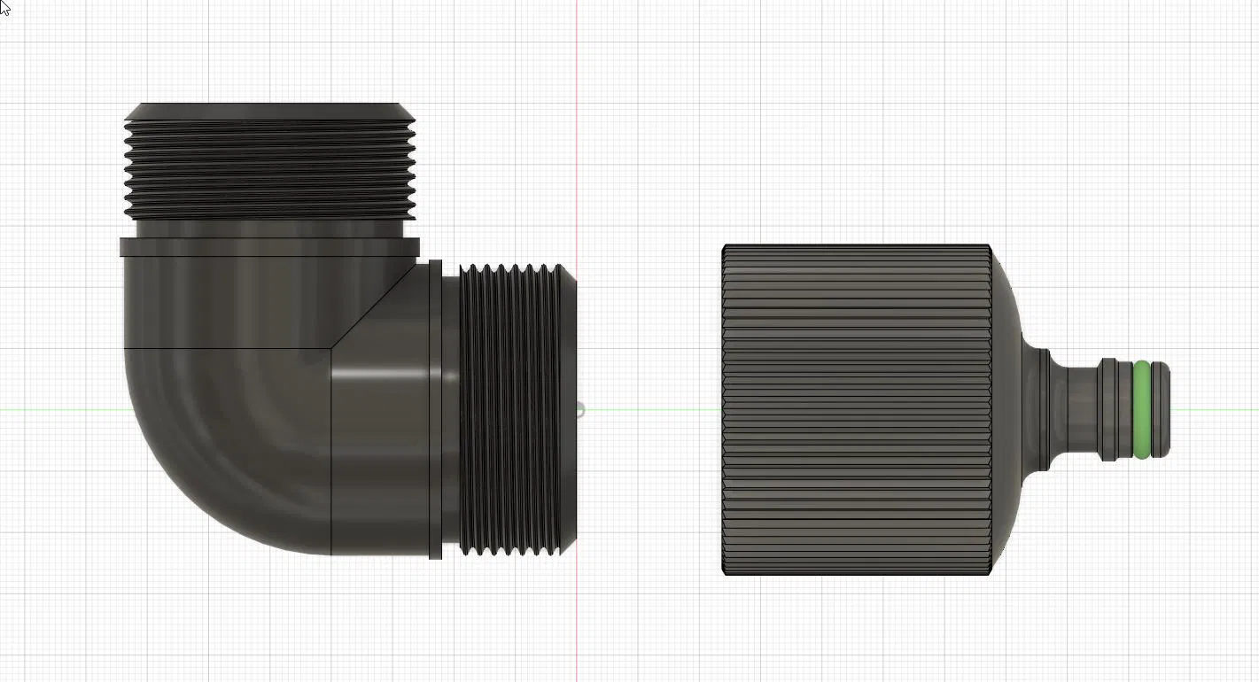 Mình tạo một adapter từ ren trong 44,9 mm (G1½) [angle adaptor] sang ống Gardena, hoặc đầu quick release. Cái này cũng hợp với các loại connector khác (Hoselock, no-name, Gardena).