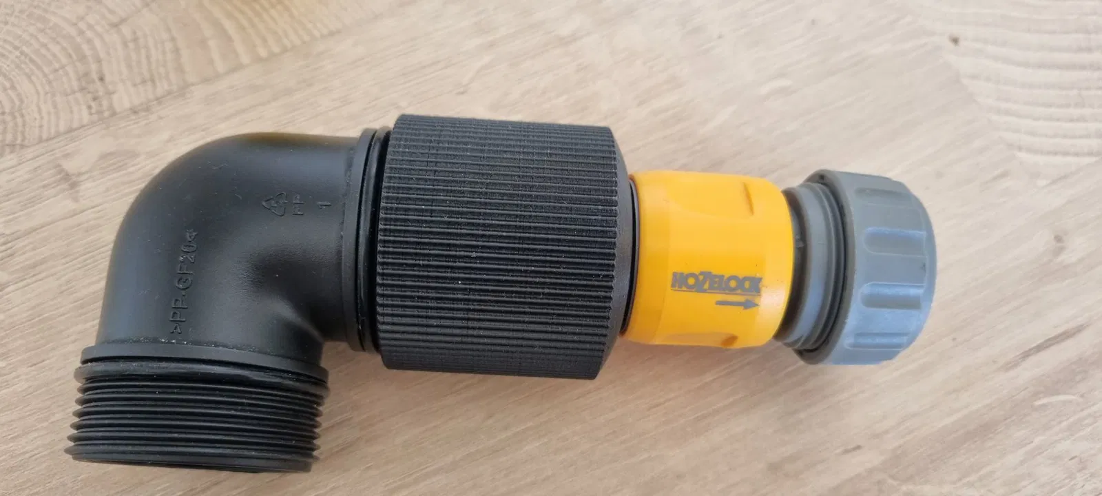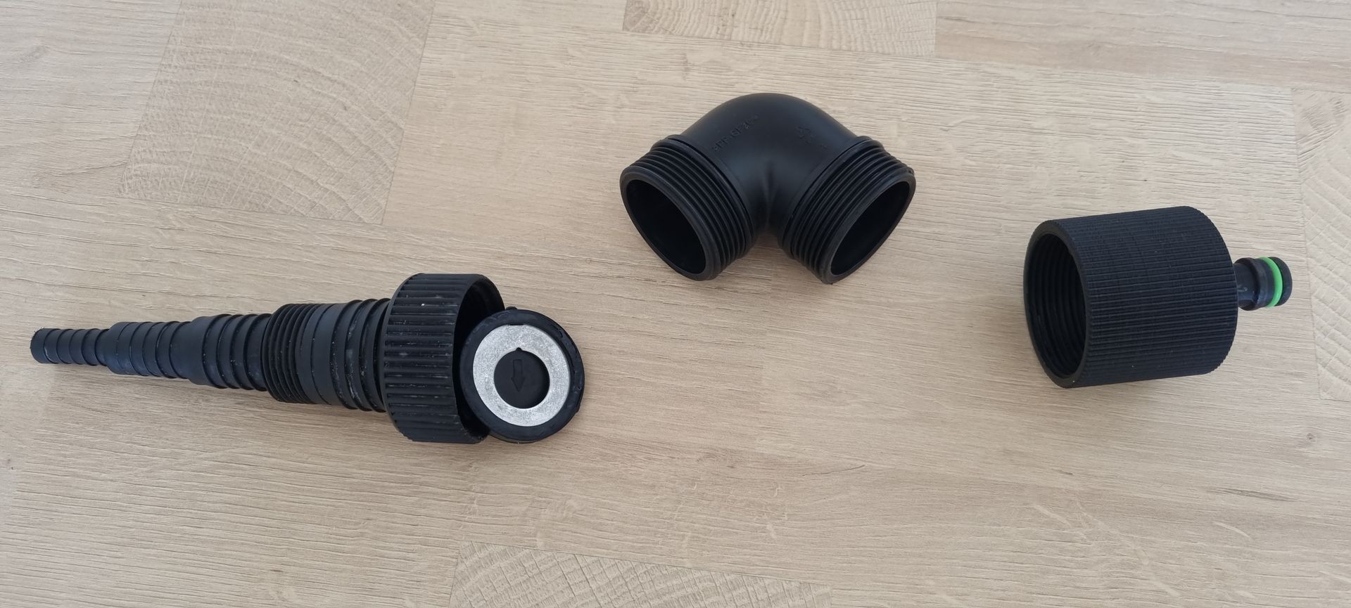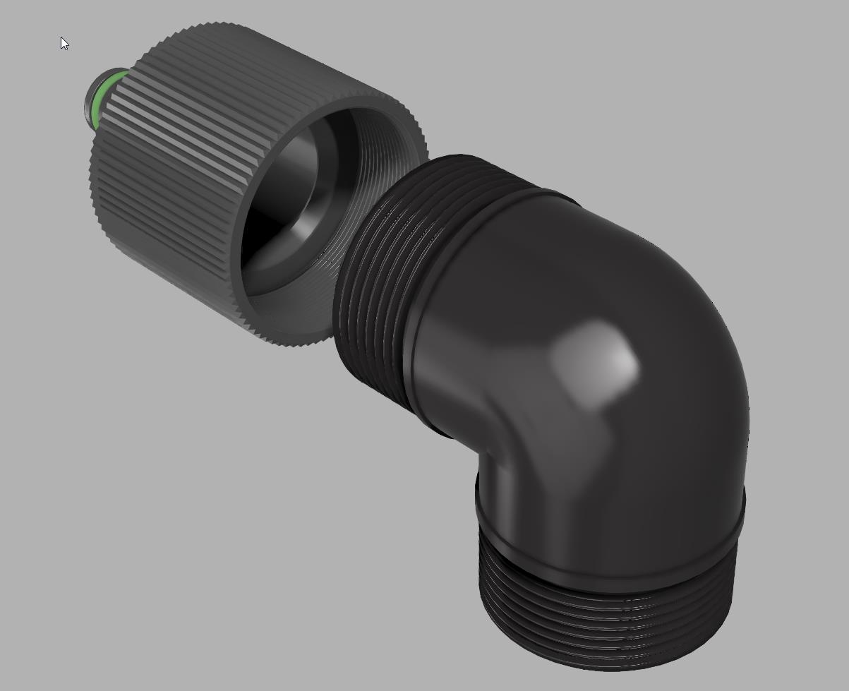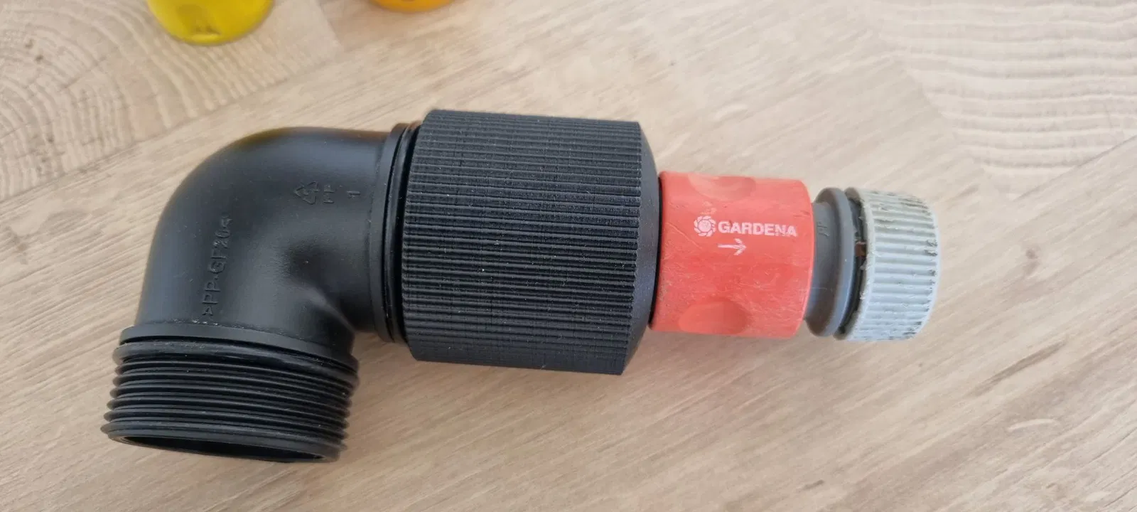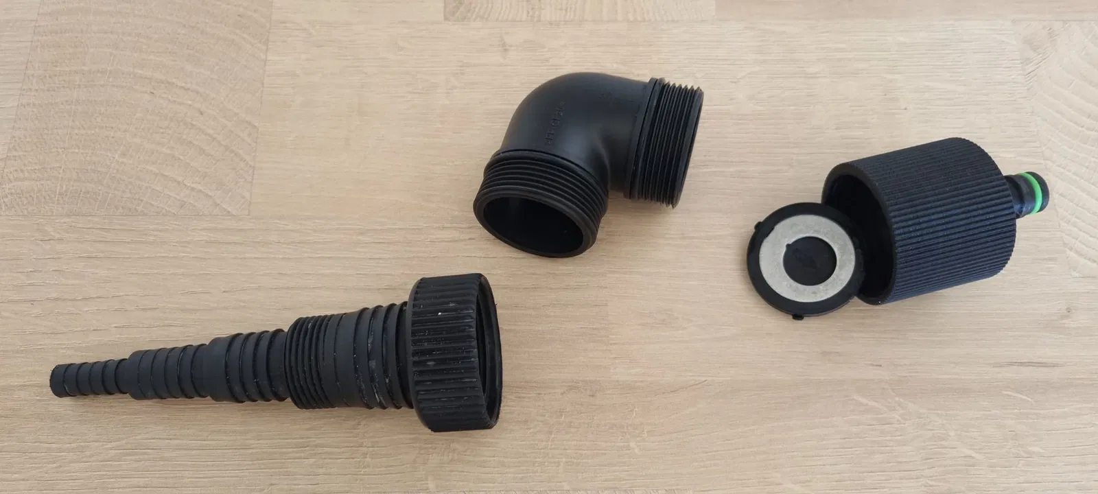 Mình tạo một adapter từ ren trong 44,9 mm (G1½) [angle adaptor] sang ống Gardena, hoặc đầu quick release. Cái này cũng hợp với các loại connector khác (Hoselock, no-name, Gardena).