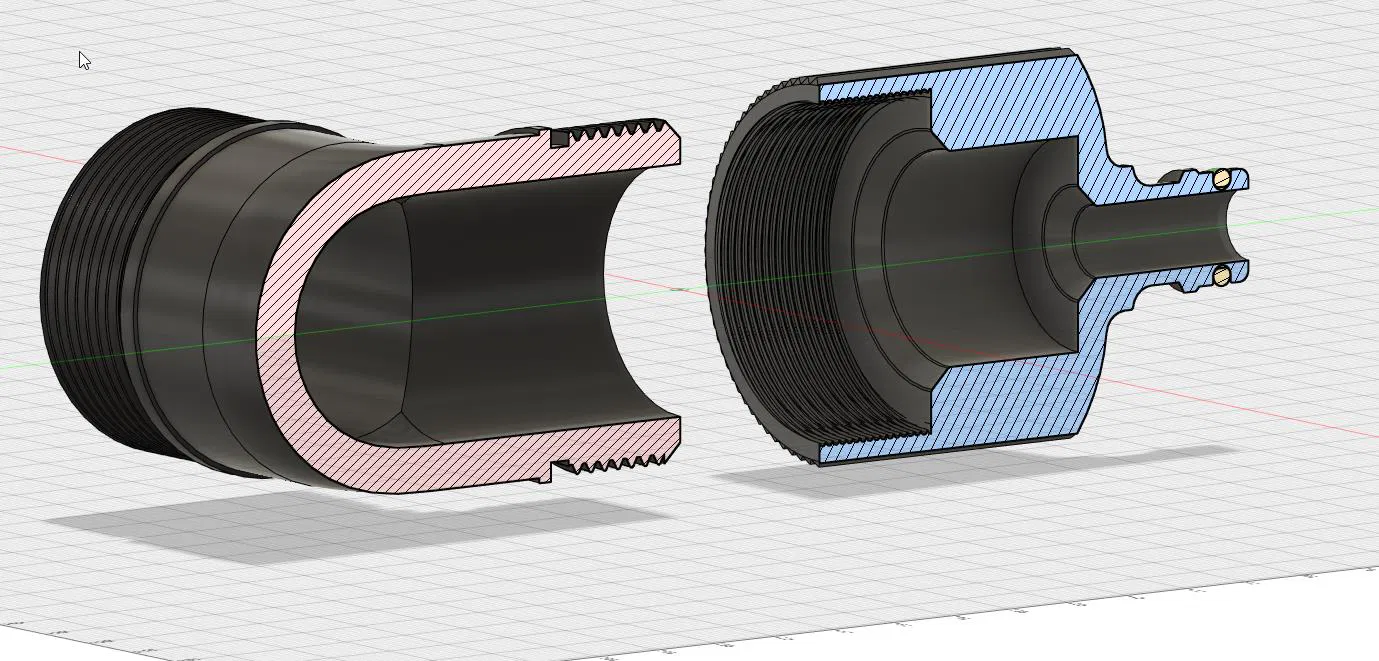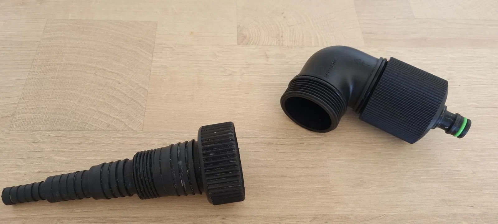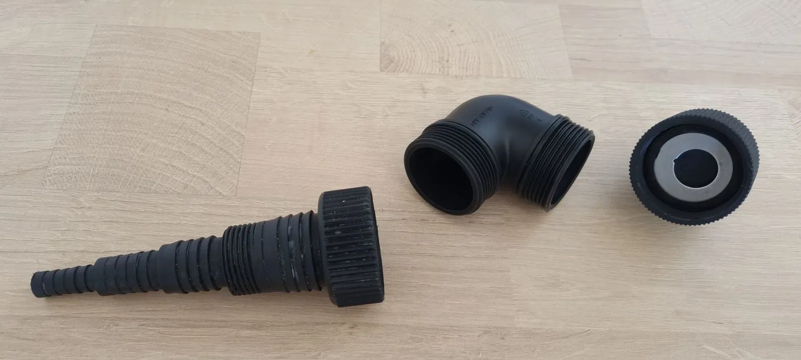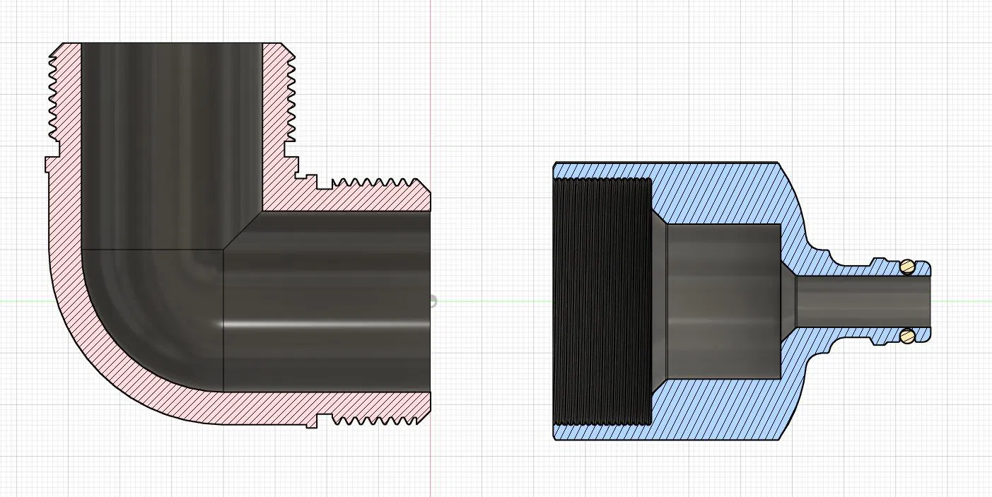 Mình tạo một adapter từ ren trong 44,9 mm (G1½) [angle adaptor] sang ống Gardena, hoặc đầu quick release. Cái này cũng hợp với các loại connector khác (Hoselock, no-name, Gardena).
