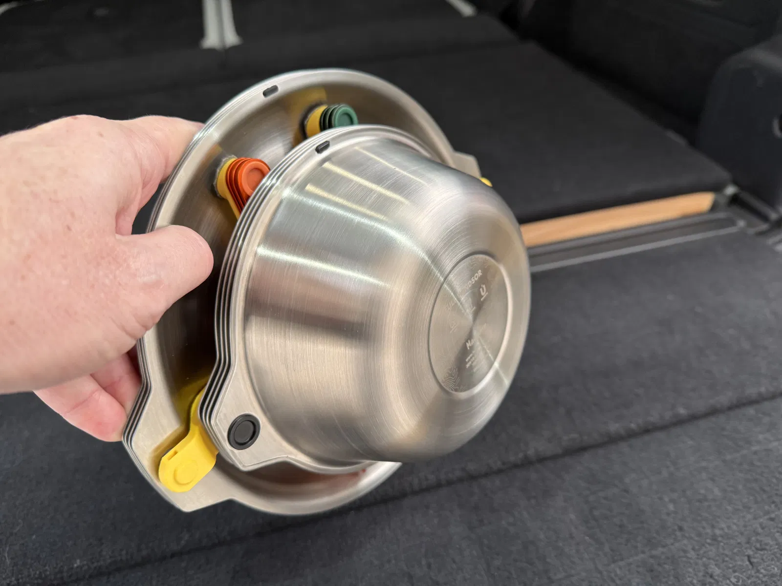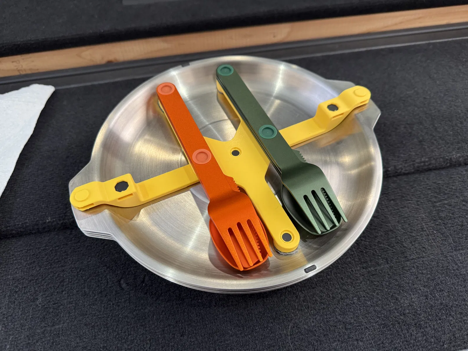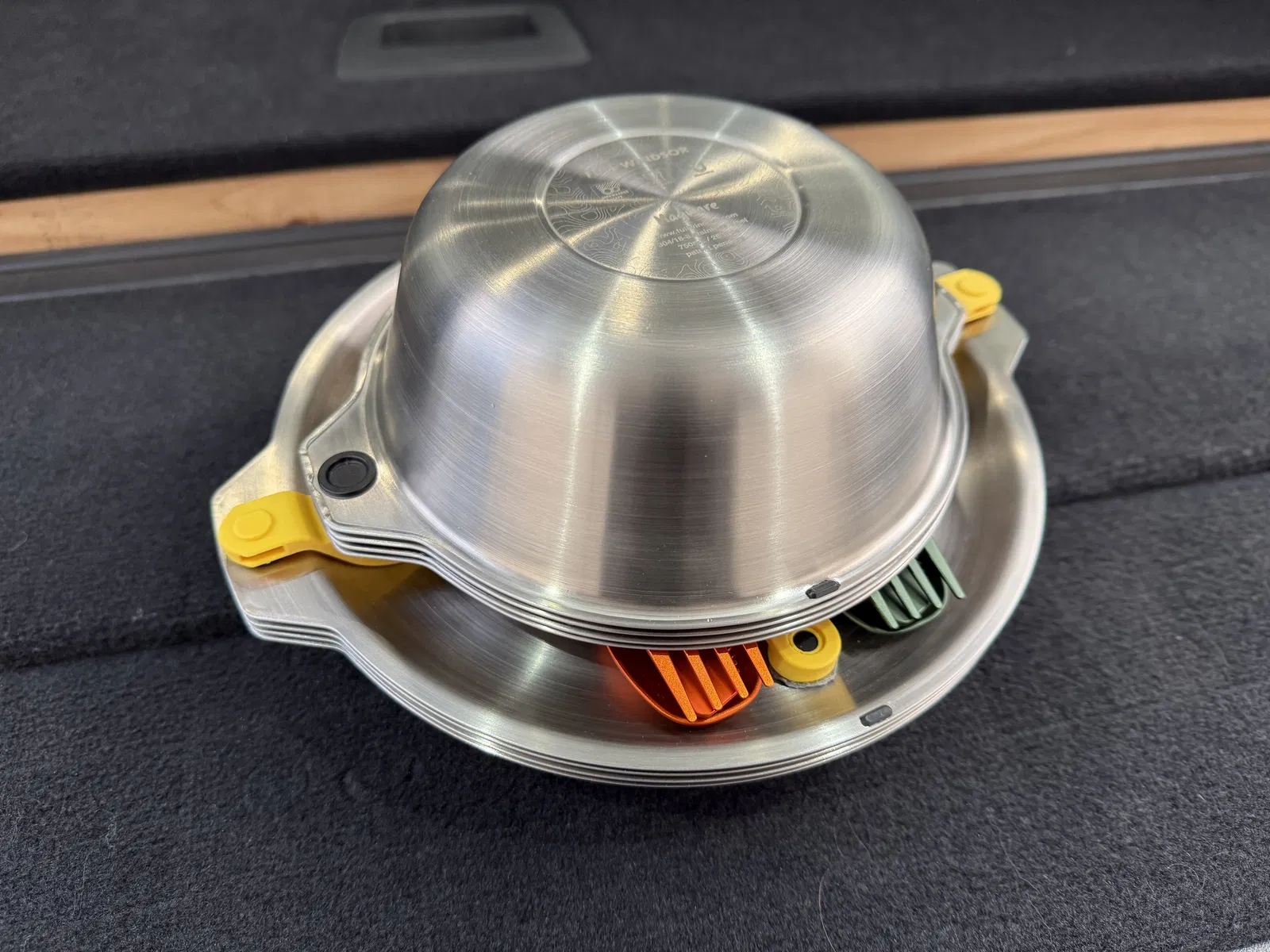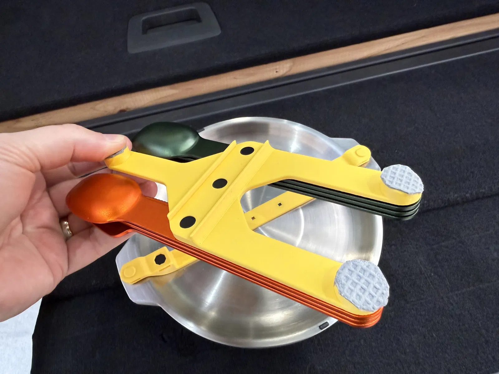 Đây là một mẫu in đơn giản giúp sắp xếp mấy món dĩa/tô/muỗng nĩa Magware. Thiết kế này nhằm giữ chúng lại với nhau theo kiểu gọn gàng vừa phải và tránh bị va đập lạch cạch. Phần kẹp dụng cụ (utensil mount) có thể chứa tối đa 3 bộ dụng cụ ăn, nhưng là tuỳ chọn. Nếu bạn có từng bộ riêng kèm ống vải (fabric sleeves), thì cũng rất hợp để đặt 2 bộ giữa các cái tô (nguyên trong sleeve) và không cần dùng utensil mount.