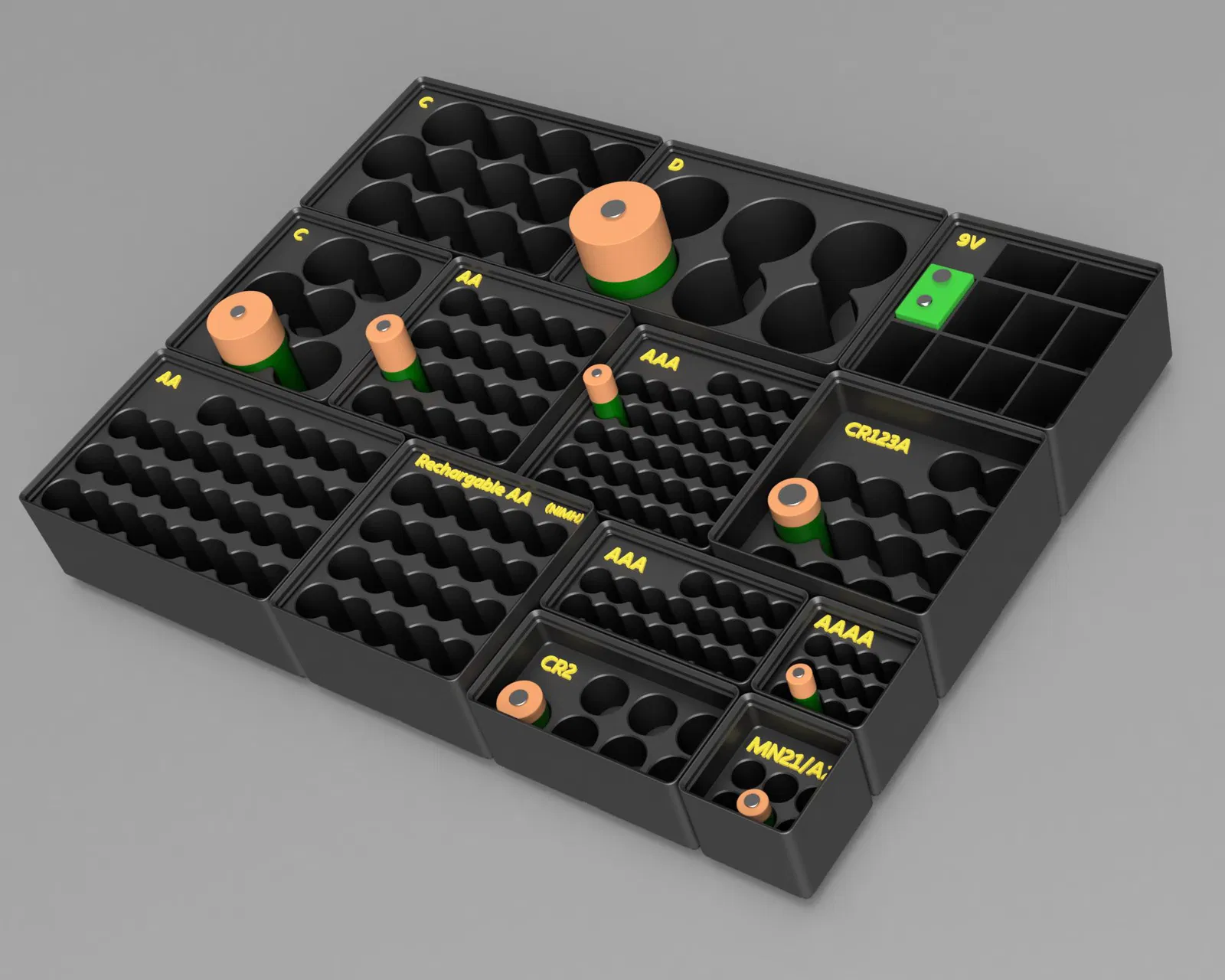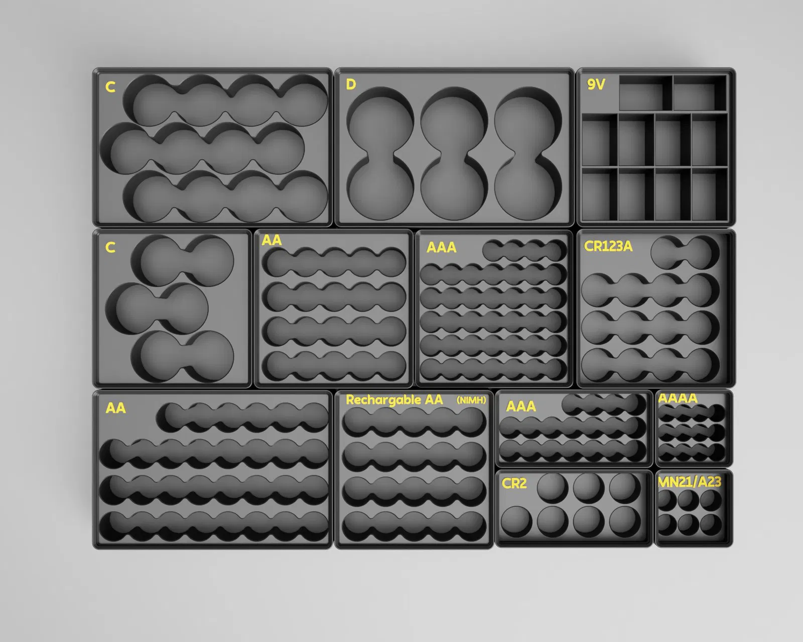 Vì vậy, mình làm thêm một bộ khay bổ trợ cho các loại pin AA, AAA, AAAA, C, D, 9V, CR123A, CR2 và MN21/A23. Mấy khay này được thiết kế để chứa số lượng pin tiêu chuẩn, cộng thêm dư vài viên. Nhờ vậy khi sắp hết, bạn có thể đổ thêm một vỉ/gói pin mới vào mà không bị tràn. Có 2 dòng chính, mô tả bên dưới: Partial Height & Full Height.