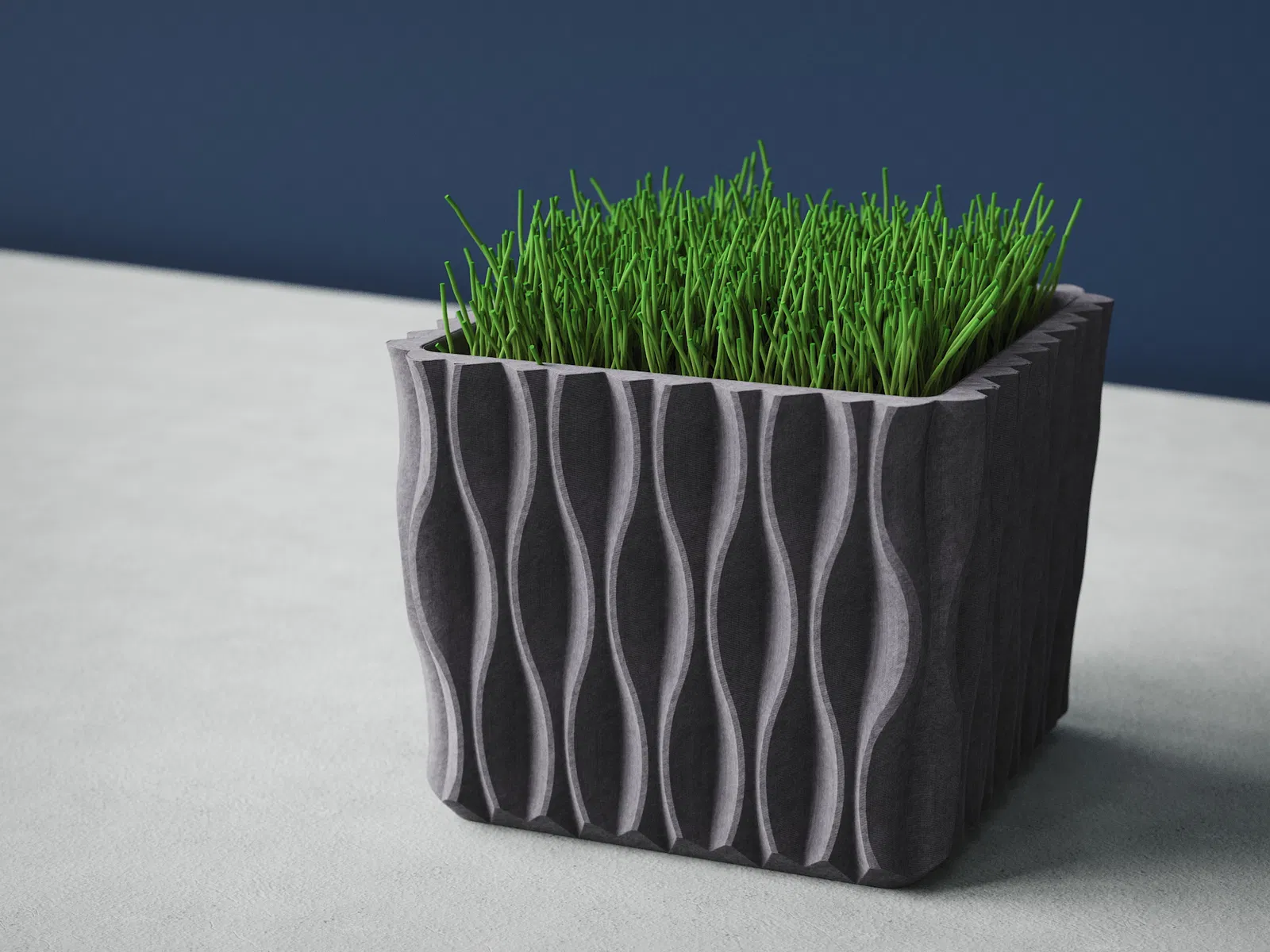 Mẫu chậu trồng cây vuông phong cách hiện đại với hoạ tiết sóng uốn cong mềm mại. In 3D không cần support, phù hợp decor trong nhà. Có thể scale theo kích thước bạn muốn để trồng cây hoặc cắm hoa.