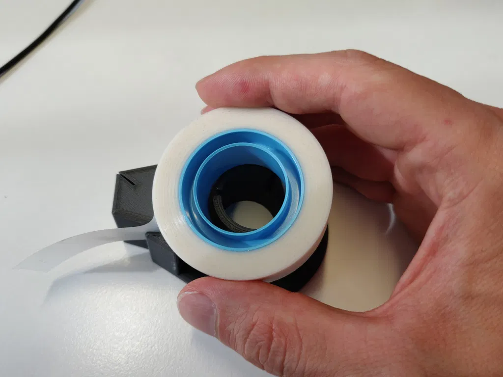 Mẫu đồ nhả băng keo/con lăn tối giản cho Scotch tape, dùng cuộn ID 25mm và OD tối đa 55mm. Có thể dùng kiểu thường hoặc quấn băng keo qua lỗ trong để làm con lăn mini; hỗ trợ gắn lưỡi cắt 20mm.