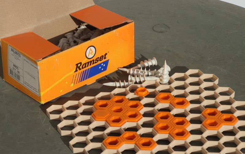 Các khớp/đầu nối để gắn Honeycomb Storage Panels lên tường nội thất bằng plasterboard hoặc drywall, dùng tắc kê plasterboard Ramset Wallmates WM25. Tắc kê này đủ để giữ các tấm panel, không cần thêm vít nào nữa.