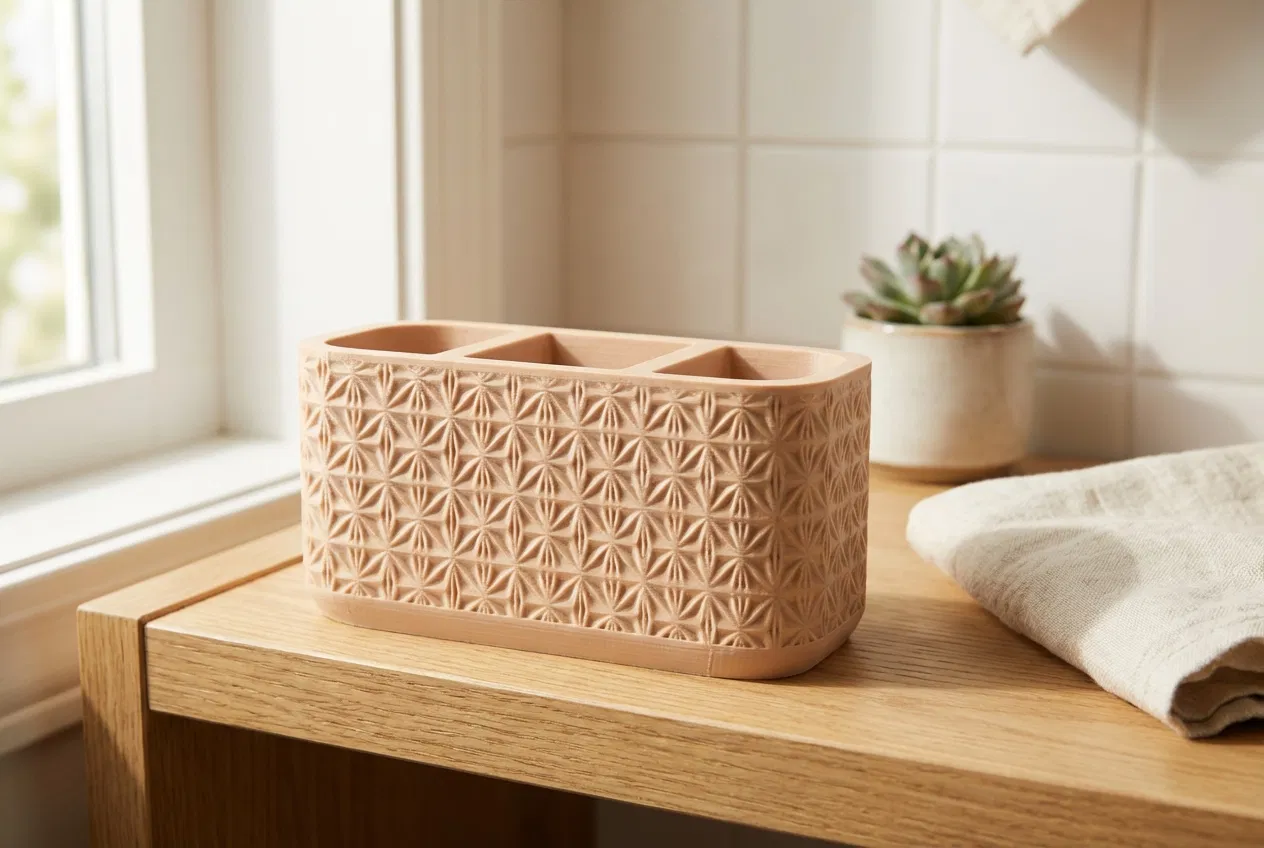 Một mẫu desk organizer hiện đại với bề mặt hoa văn hình học nhẹ nhàng và lớp hoàn thiện matte dịu mắt. Thiết kế gồm ba ngăn, giúp bạn sắp xếp gọn gàng các món dùng hằng ngày — bút, cọ, dụng cụ, stationery hoặc phụ kiện nhỏ.
