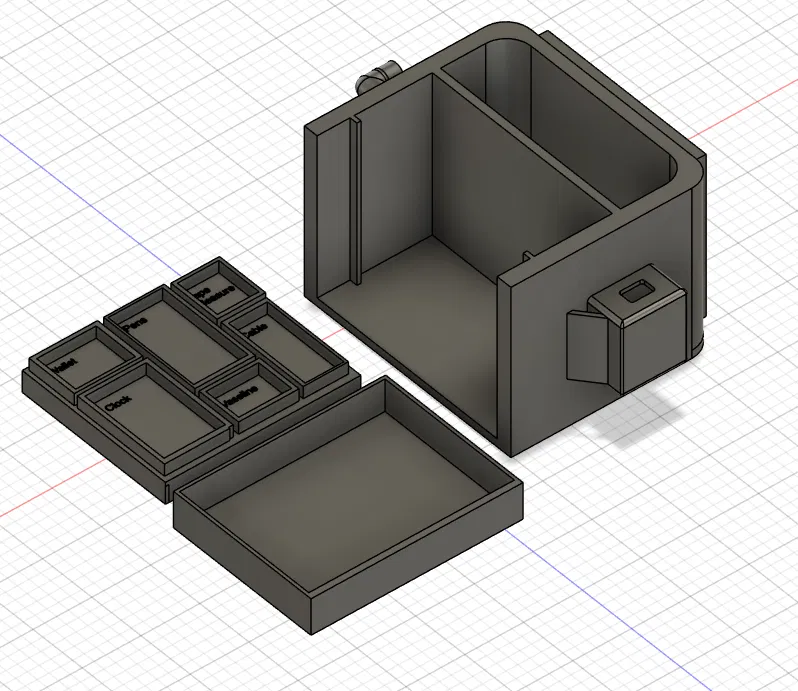 Mình đã upload 3 file cho phần thân chính (main body), khay gethin (gethin tray) và kệ trên (top shelf) — đây là những phần cần in. Hoặc bạn có thể in file “desk organizer seperated” để in cả 3 phần chung một lượt.