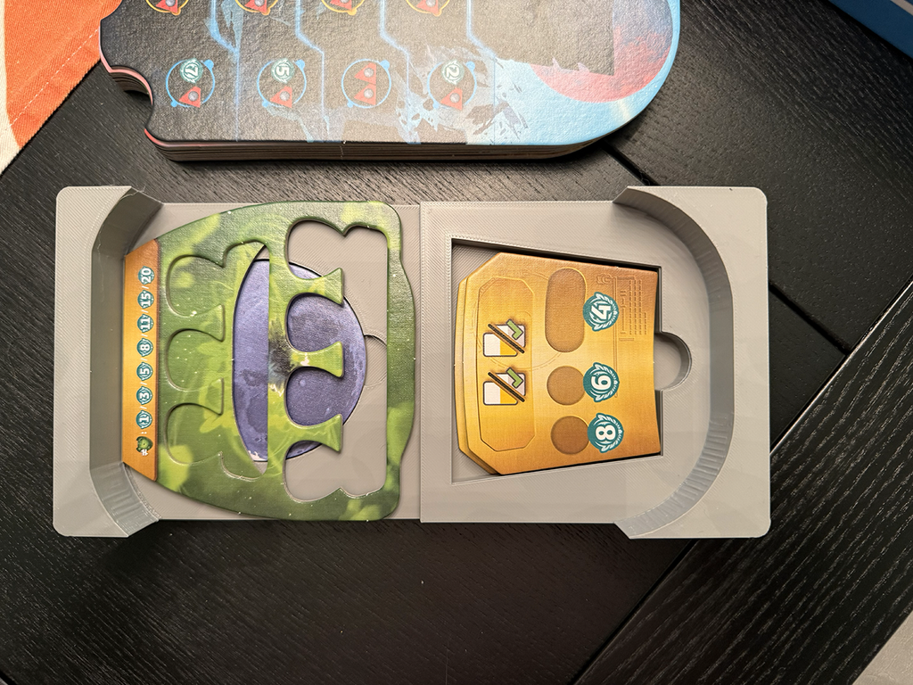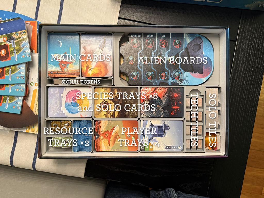 Khay main cards chứa toàn bộ project cards cũng như quick start cards. Khay alien boards chứa các alien boards, có chừa phần khoét cho sub-board Amoeba; bên dưới để được gold scoring tiles, 2 system rotation tokens và first player token. Các tech tile holders (remix từ tech tile holder của W1mL33na3rts) chứa đủ 16 tech tiles cho mỗi loại tech, đồng thời để được các bonus 2 VP tiles trên mỗi chồng. Player trays chứa các marker và token 100 điểm ở ngăn lớn, probes ở ngăn nhỏ, còn VP và publicity markers nằm ở các ô riêng. Alien species trays chứa các miếng cardboard cho từng species, phía trên chồng lên bằng các lá cards. (Hai species 'Oumuamua và Amoeba dùng lựa chọn tray B.) Khay signal token chứa 10 signal tokens, 4 extra (blank) tokens và token Futurespan. Cuối cùng, token cho chế độ solo (trừ long term objective tiles) để trong solo tiles holder; còn miếng sun và 3 tile Xenolab sẽ đặt vào khe thứ ba (vốn trống). Các solo cards từ cả base game lẫn expansion, cùng với long-term objective tiles, để trong khay solo action cards. (Rulebooks, player reference cards, species rules và toàn bộ các mảnh board sẽ đặt nằm lên trên các khay.)
