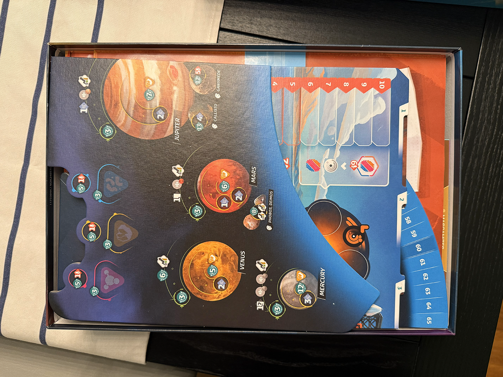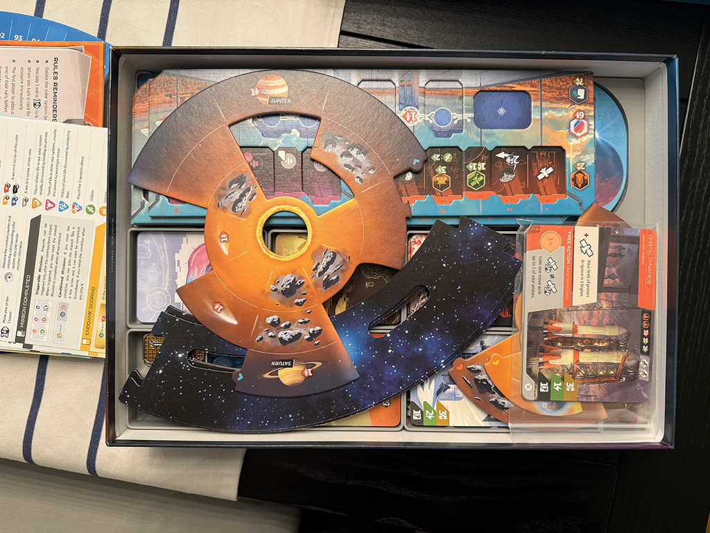 Main cards (1) Alien boards and other tokens (1) Signal token tray (1) Tech tiles box (1) Tech tiles holder (3) Player tray (4) Alien species tray A (6) Alien species tray B (2) Resource tray (2) Solo action cards (1) Solo tiles holder (1) Sun diffuser (optional)