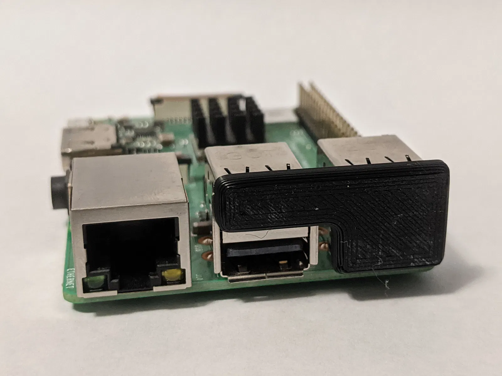 Mẫu nắp che giúp che một phần hoặc toàn bộ cổng USB trên Raspberry Pi (như Raspberry Pi 3/4), hỗ trợ thợ lắp đặt nhận biết và cắm đúng dây/cáp, hạn chế cắm nhầm trong quá trình triển khai.
