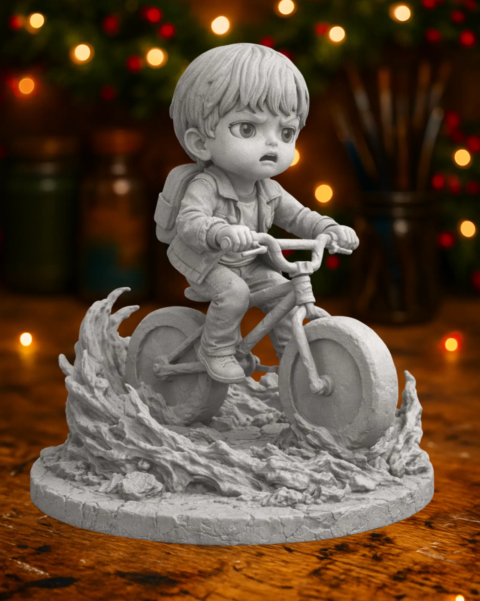 Mẫu tượng 3D phong cách chibi lấy cảm hứng từ Eleven trong Stranger Things, tái hiện khoảnh khắc đạp xe mang tính biểu tượng. Phù hợp để trưng bày, sưu tầm hoặc sơn trang trí.