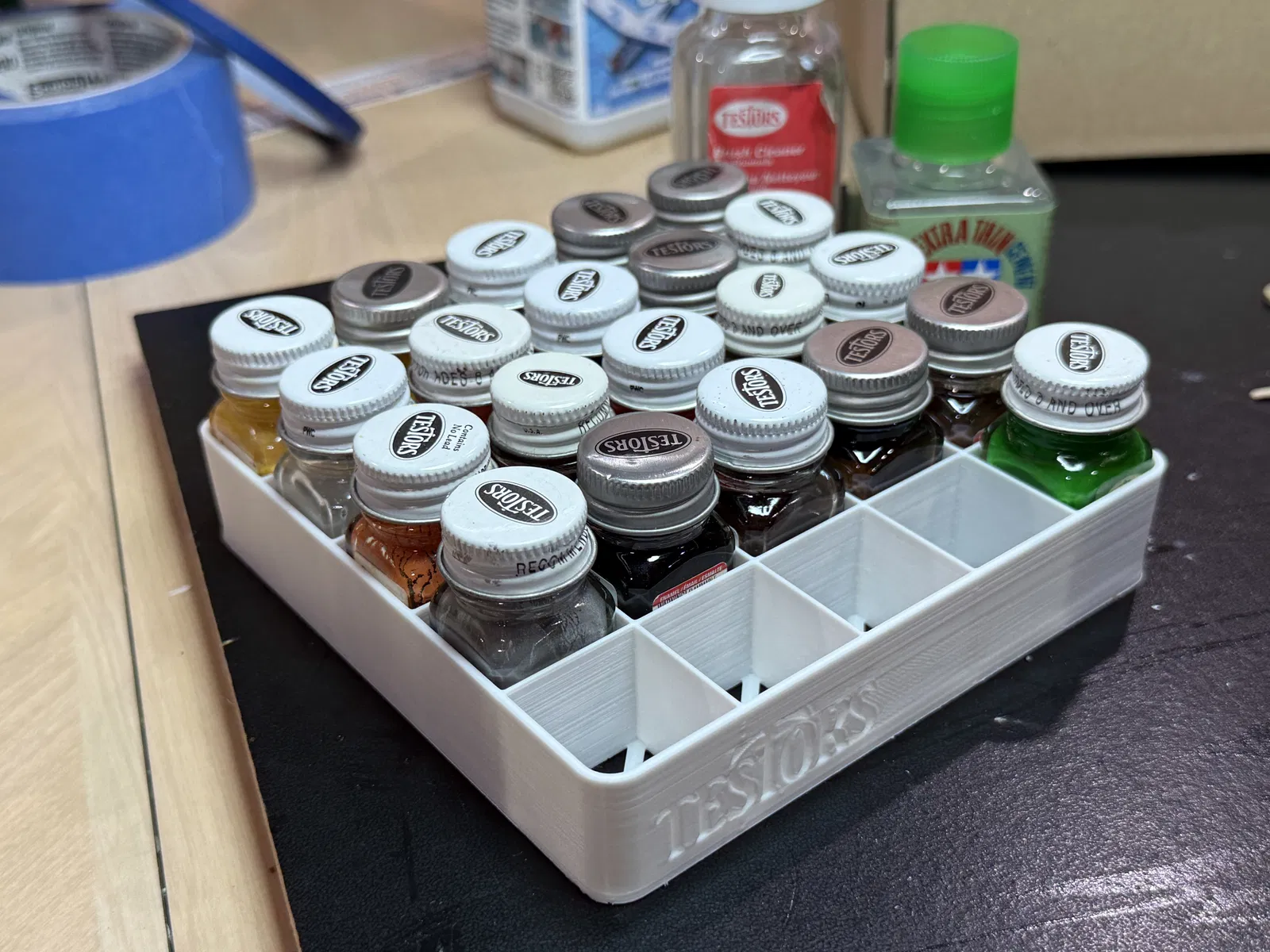Khay đựng 25 chai sơn mô hình Testors, thiết kế tối giản chỉ tập trung giữ chai, không kèm chỗ để cọ. Tối ưu để in nhanh: không cần support, cứ dùng setting mặc định. Tác giả in ~4,5 giờ trên Ender-3.