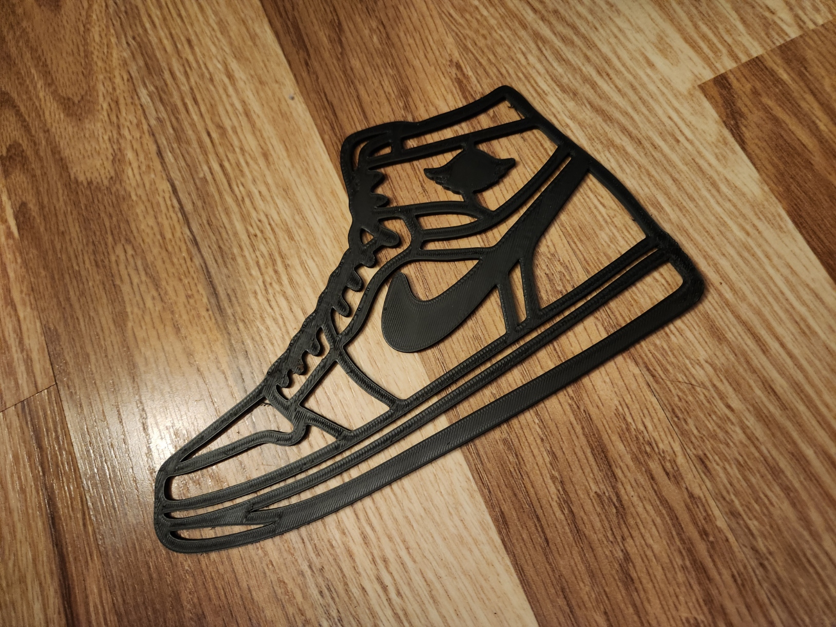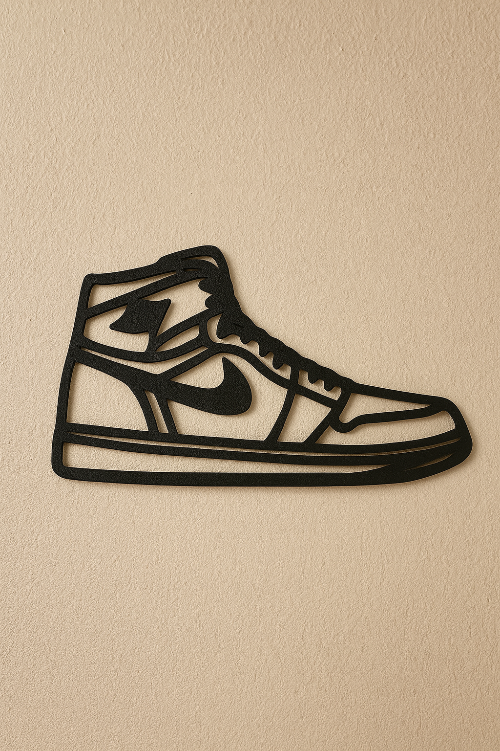 Mẫu wall-art dạng silhouette của đôi Jordan I (1) Retro kinh điển, nét viền mảnh nhìn gọn và đẹp. In nhanh, dễ, không cần supports; hợp treo phòng sneaker, góc gaming, phòng ngủ hay trưng bày shop.