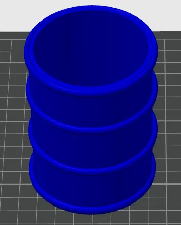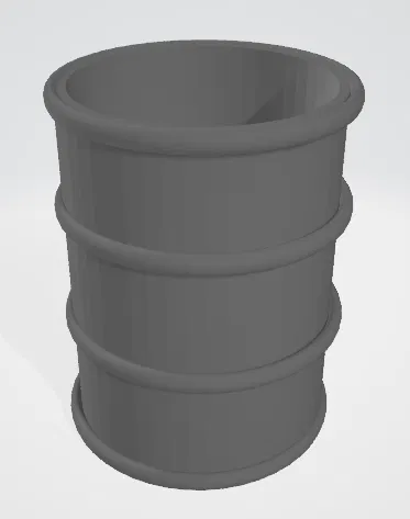 Thùng rỗng dạng barrel không có nắp, có thể scale tùy ý để làm đồ chứa. In một lần là xong, không cần supports. Mình dùng đặt dưới máng chute để hứng purge làm purge bin.