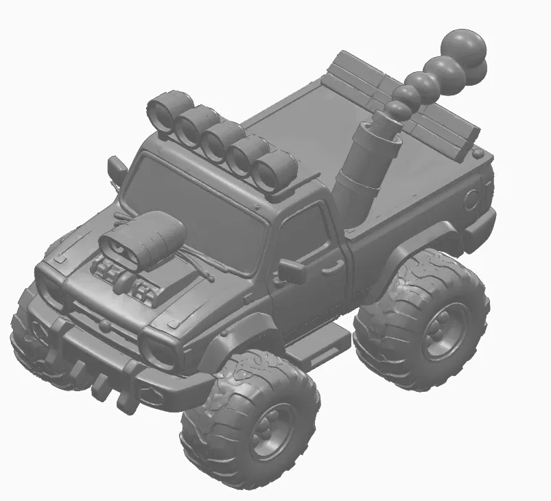 Monster truck dạng monster pickup phong cách hoạt hình, lấy cảm hứng derby với bánh xe cỡ bự, thân xe dày và hệ thống treo phóng đại. Tối ưu cho resin 3D printing độ chi tiết cao, sạch và dễ in.