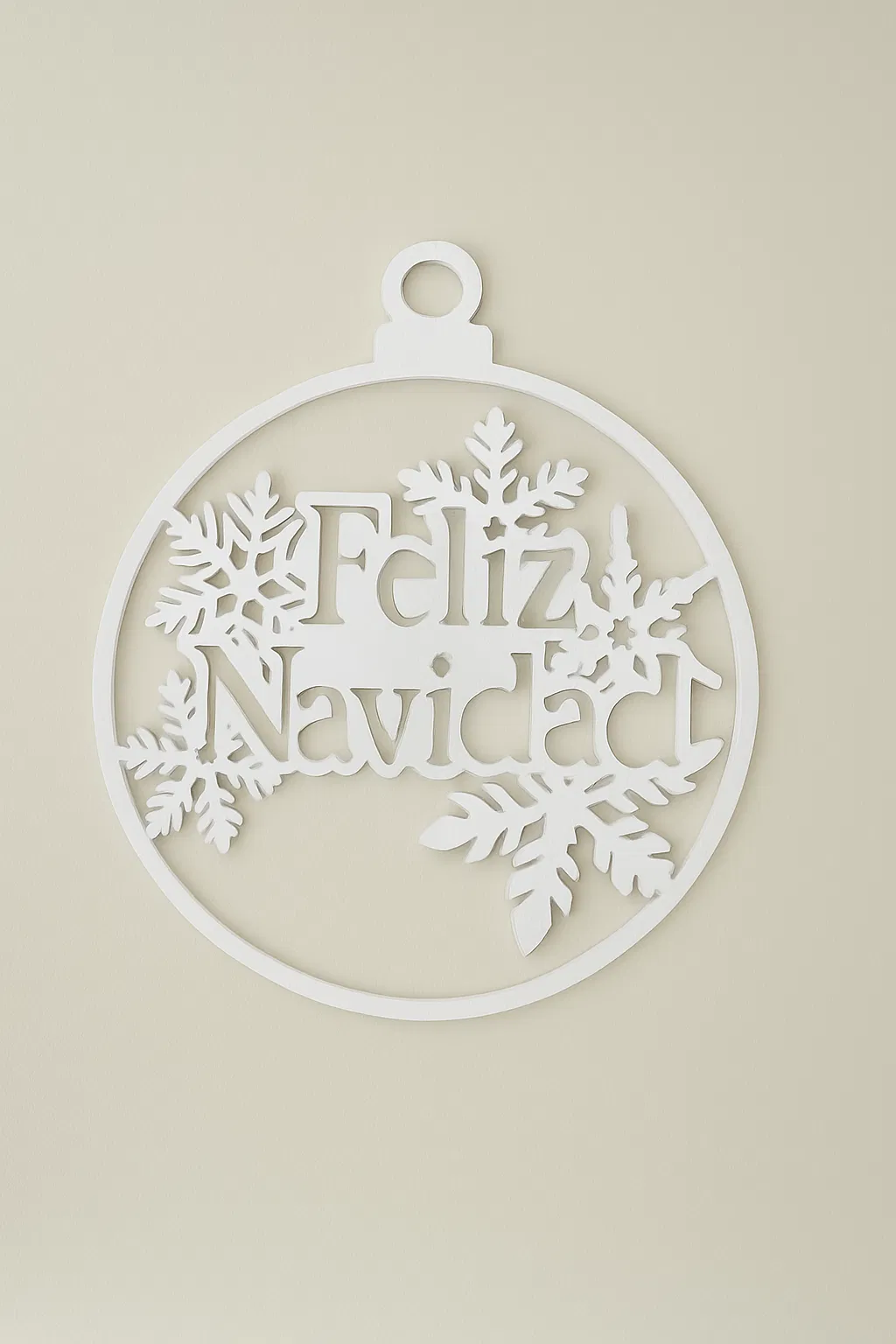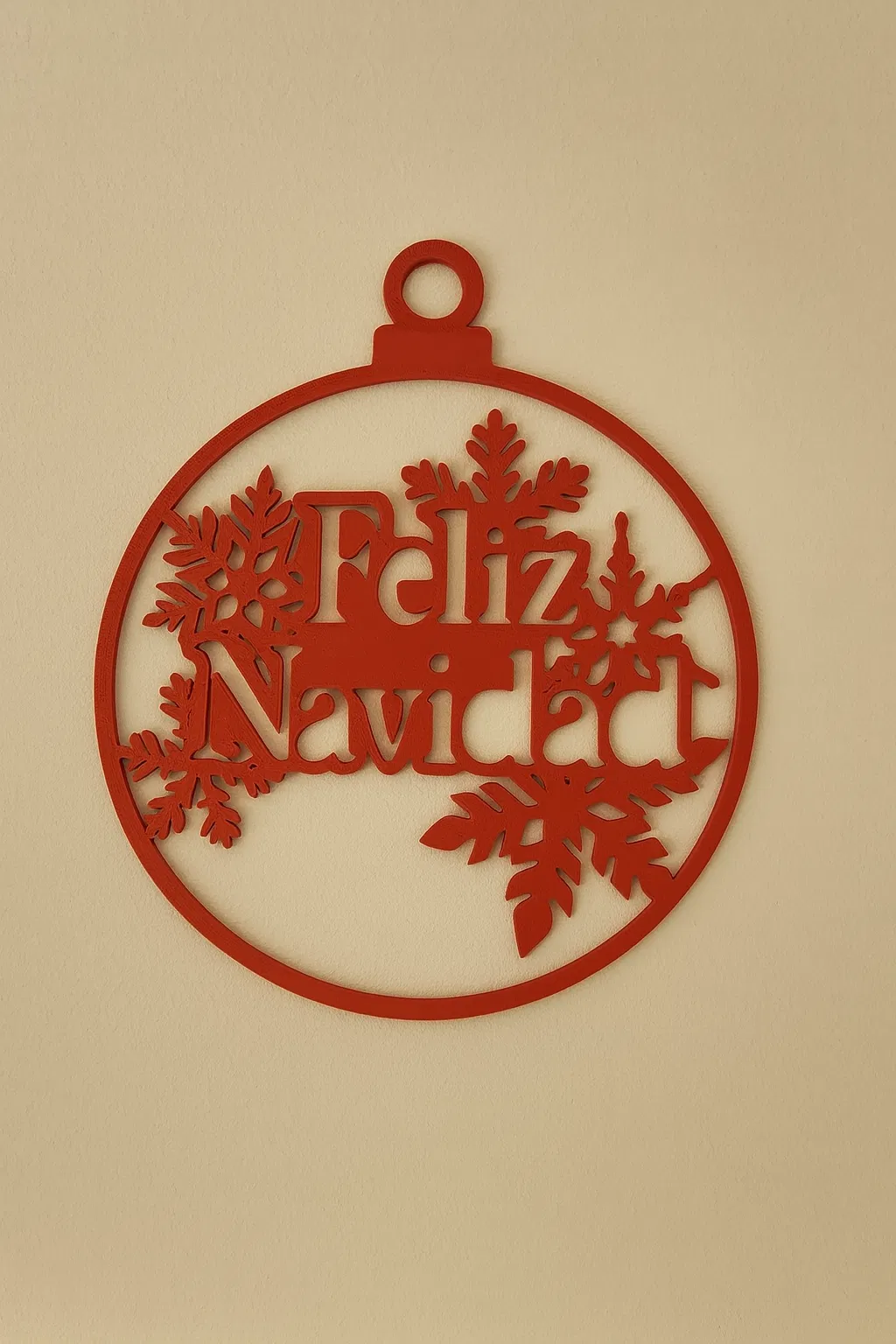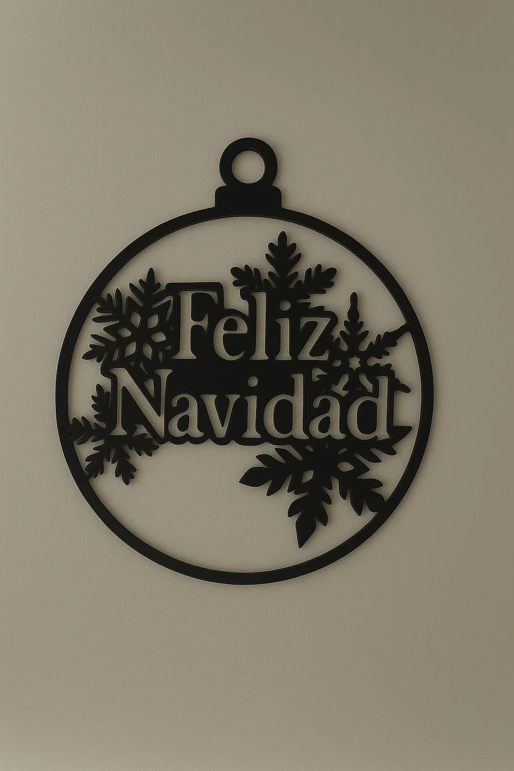 Ornament “Feliz Navidad” phong cách lễ hội, có chi tiết bông tuyết. In sạch, nhẹ, treo dễ trên cây thông, cửa hay tường. Không cần supports, hợp cho người mới, in nhanh để làm quà và trang trí Noel.