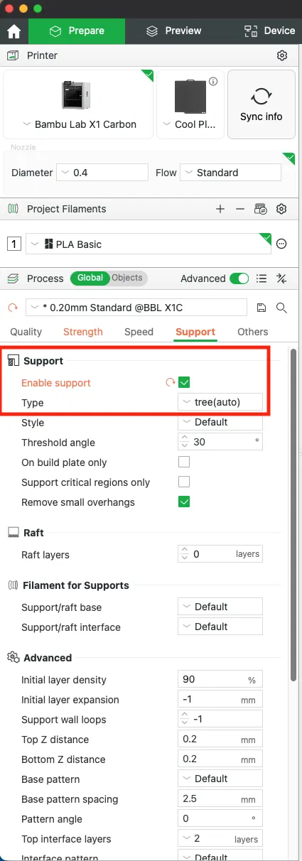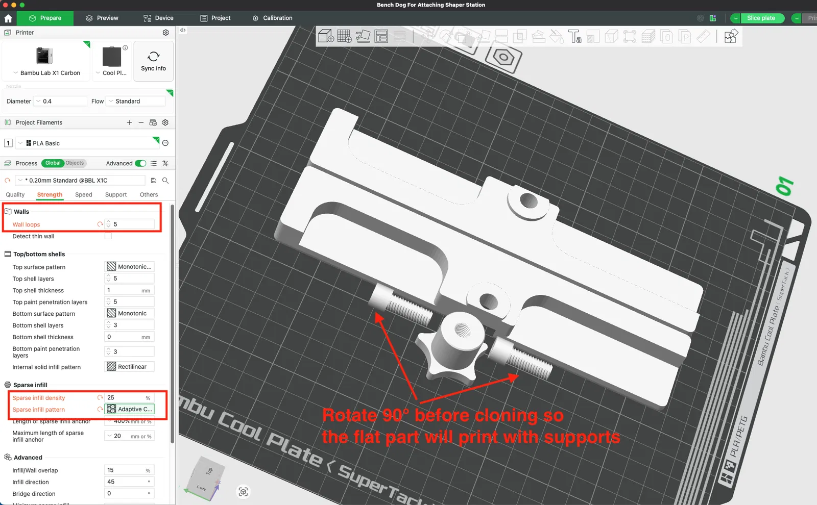 Mình in bộ này theo hướng tăng độ bền. Ảnh chụp màn hình slicer có các thiết lập. Mình cũng xoay cái bolt 90° với mặt phẳng úp xuống. Để một bên phẳng như vậy thì nó in theo hướng chịu lực tốt nhất. Support không ảnh hưởng gì tới phần ren.