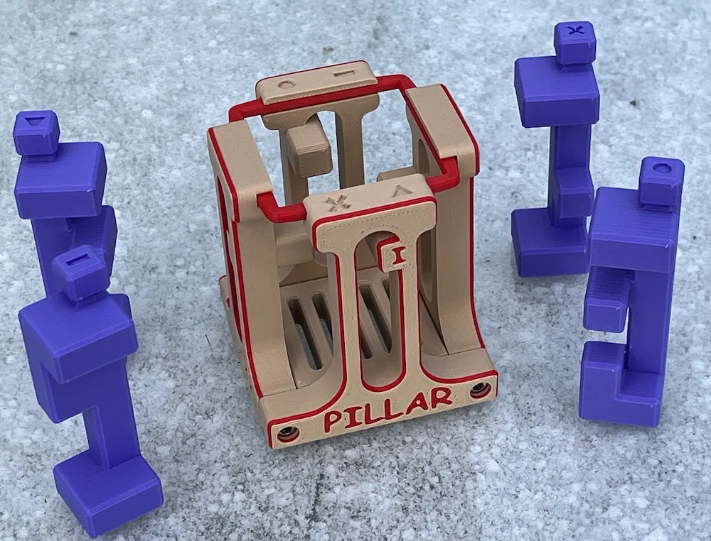 Bộ “3 Pillars of Puzzling” của Alfons Eyckmans: 3 puzzle dạng pillar/burr đã được remodel để in 3D, đa số không cần supports. Mục tiêu là rút hết “pillar” khỏi “temple” chỉ bằng linear moves, không xoay vặn.