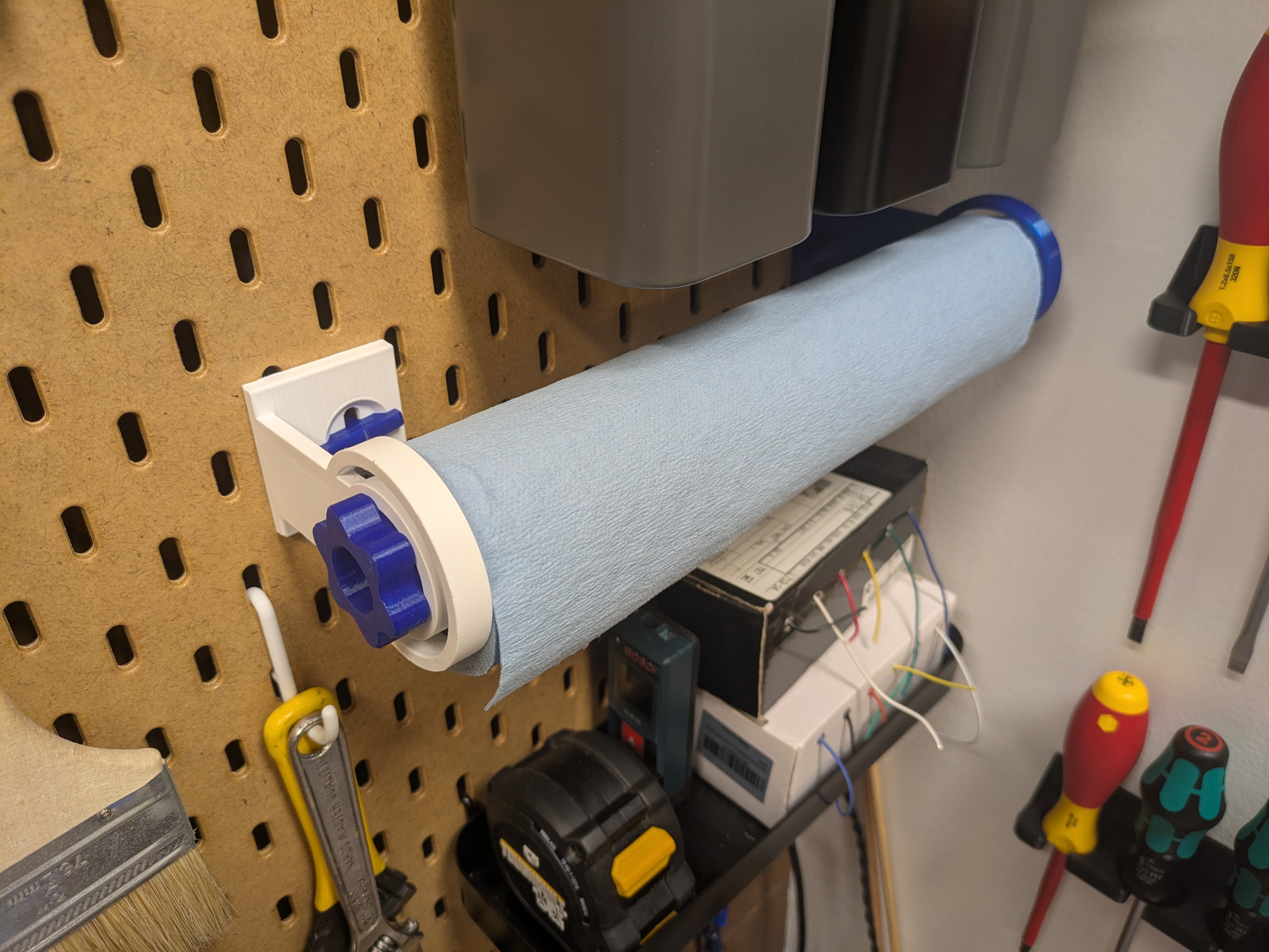 Bộ STL đã pre-customized cho cuộn Scott blue shop towel size tiêu chuẩn, dùng với Skadis. Ty ren giữa được scale nhỏ để ren dễ khớp hơn; T clip được làm dài hơn để gài xuyên qua tay đỡ và tấm Skadis. Cần in 2 cái.