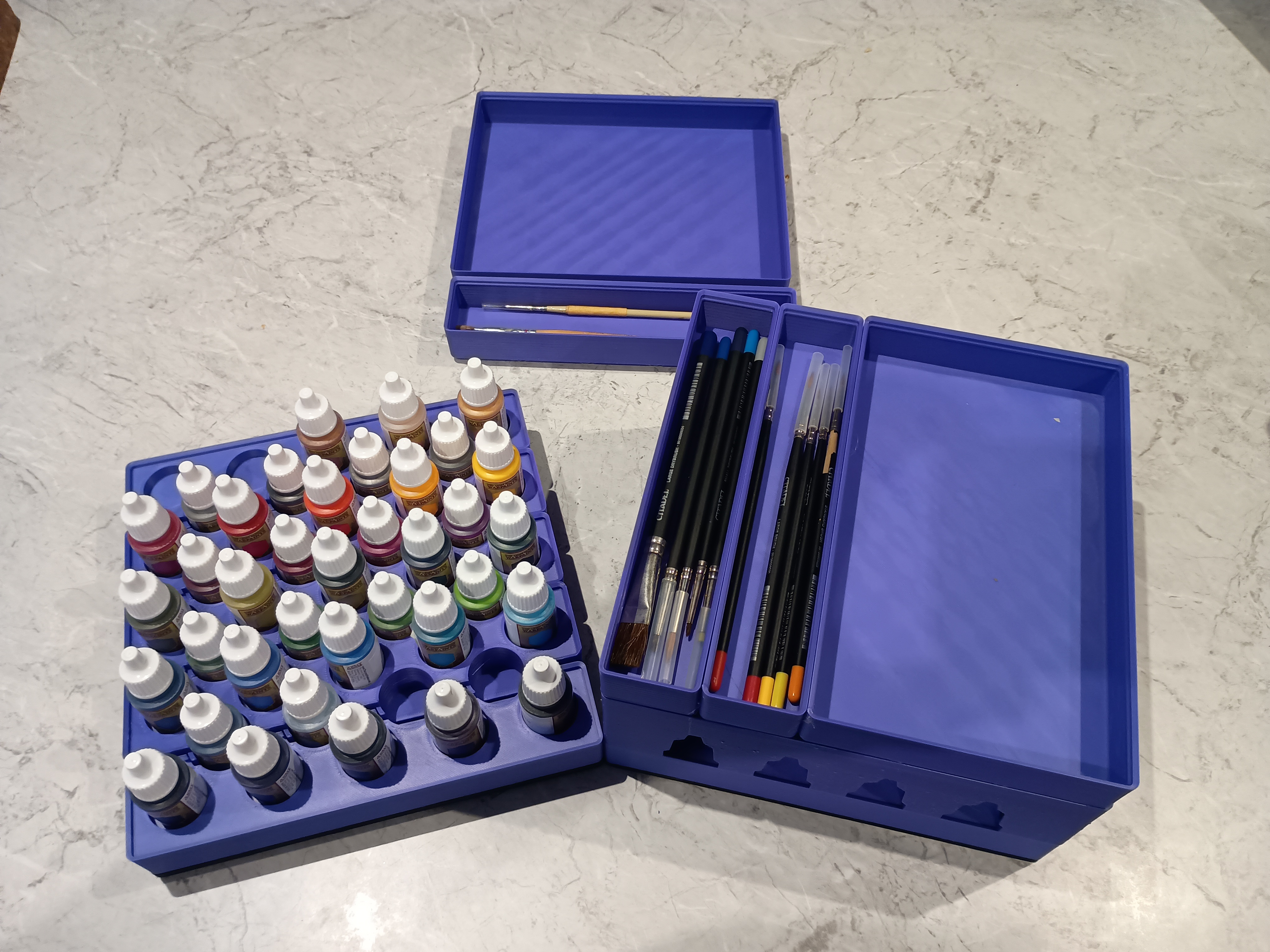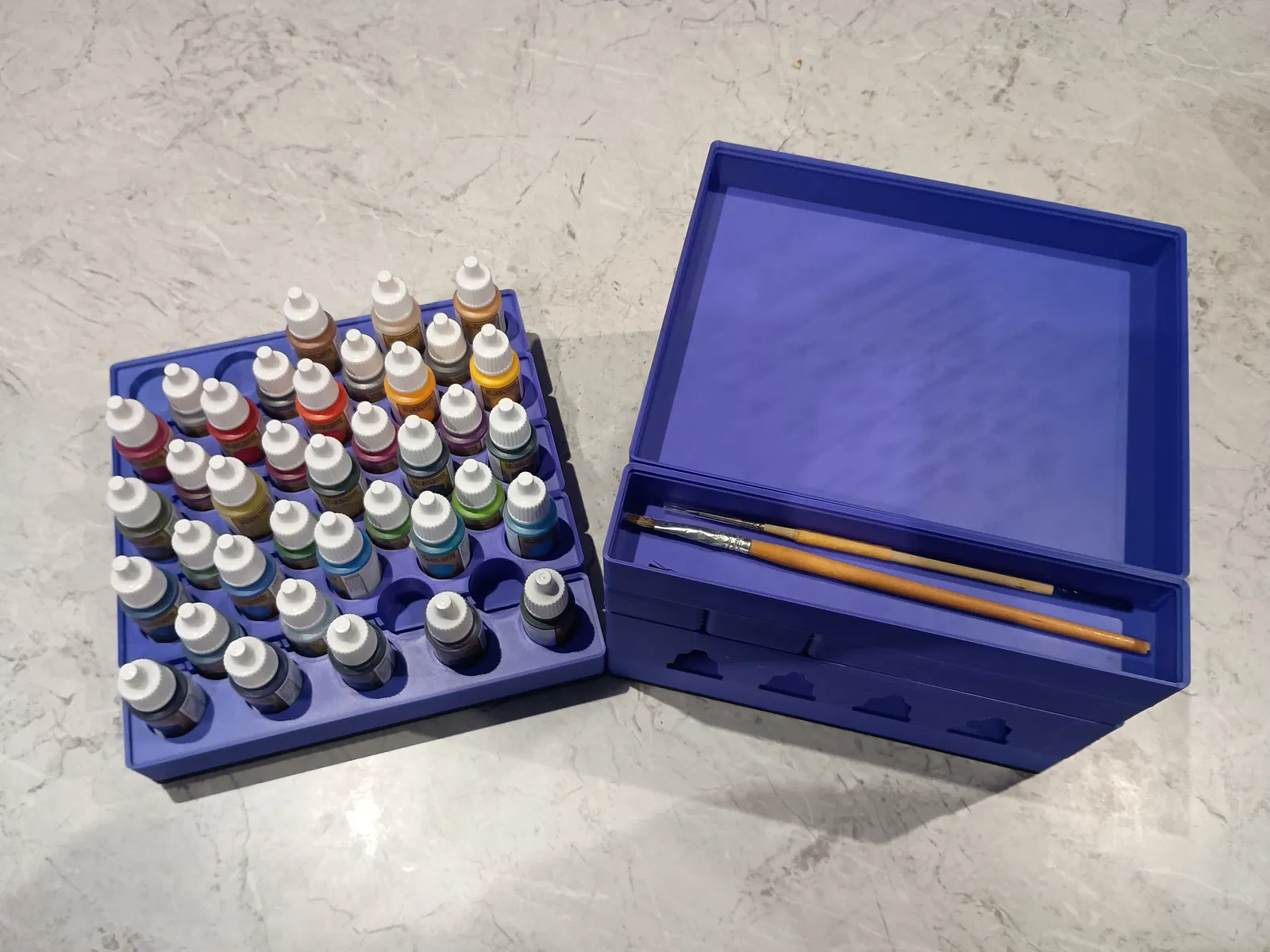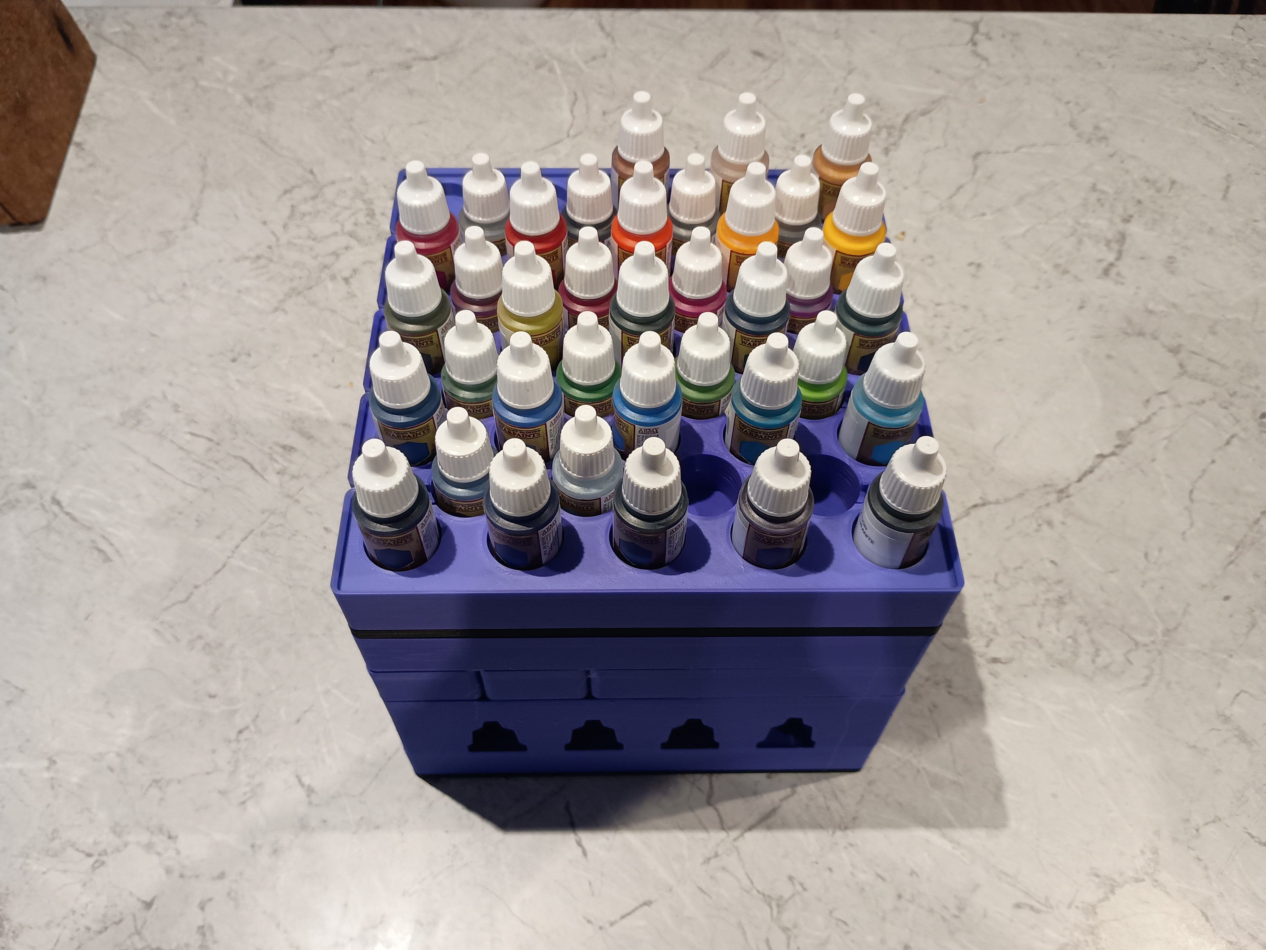 Mẫu này được thiết kế riêng cho chai sơn mini dạng dropper 25 mm của Army Painter. Nhưng chai của Vellejo và Reaper khá giống nhau nên cũng có thể vừa. Nếu không vừa thì cho mình biết nha. Chỉ cần có kích thước thì mình sẵn sàng chỉnh lại phần cut-out, đặc biệt là ở phần stacker.