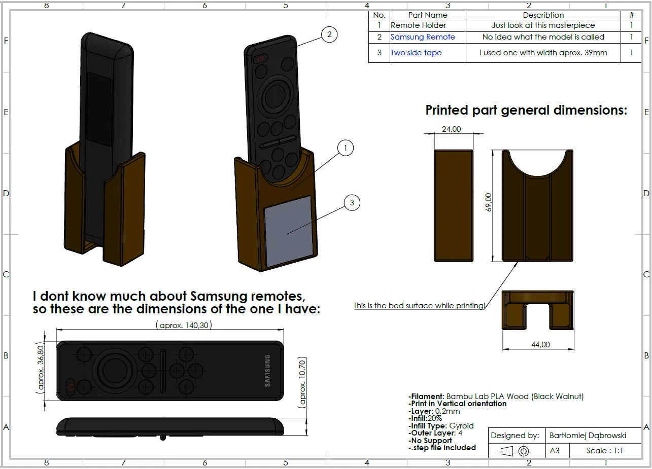 Giá đỡ (holder) đơn giản cho remote Samsung OLED, dễ chỉnh sửa. Khuyến nghị in layer 0,2mm, in đứng, infill 20% Gyroid, 4 outer layers, không cần support hay raft. Có kèm file .step để tùy biến.
